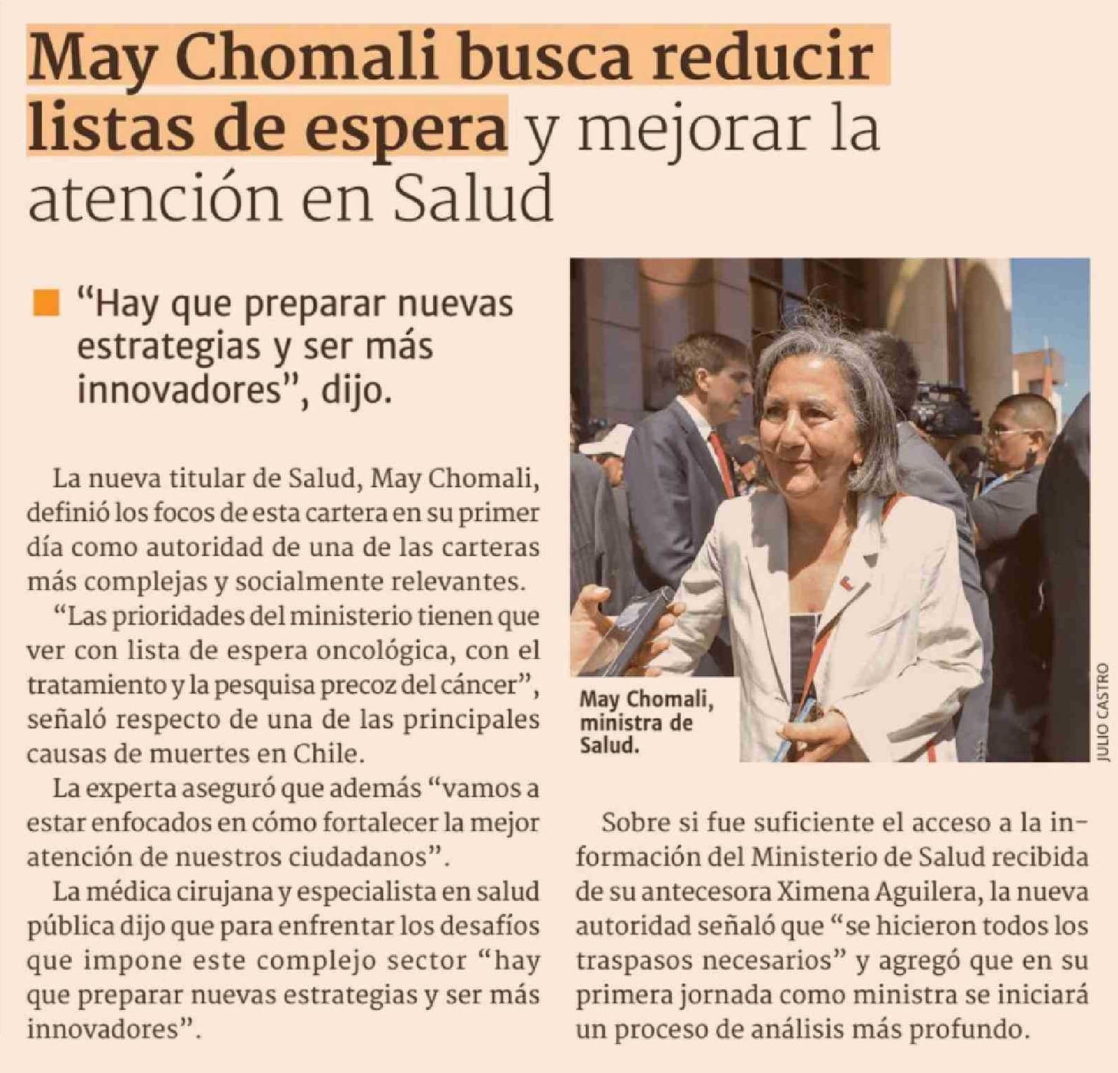 May Chomali busca reducir listas de espera y mejorar la atención en Salud 12-03-2026 Diario Financiero |