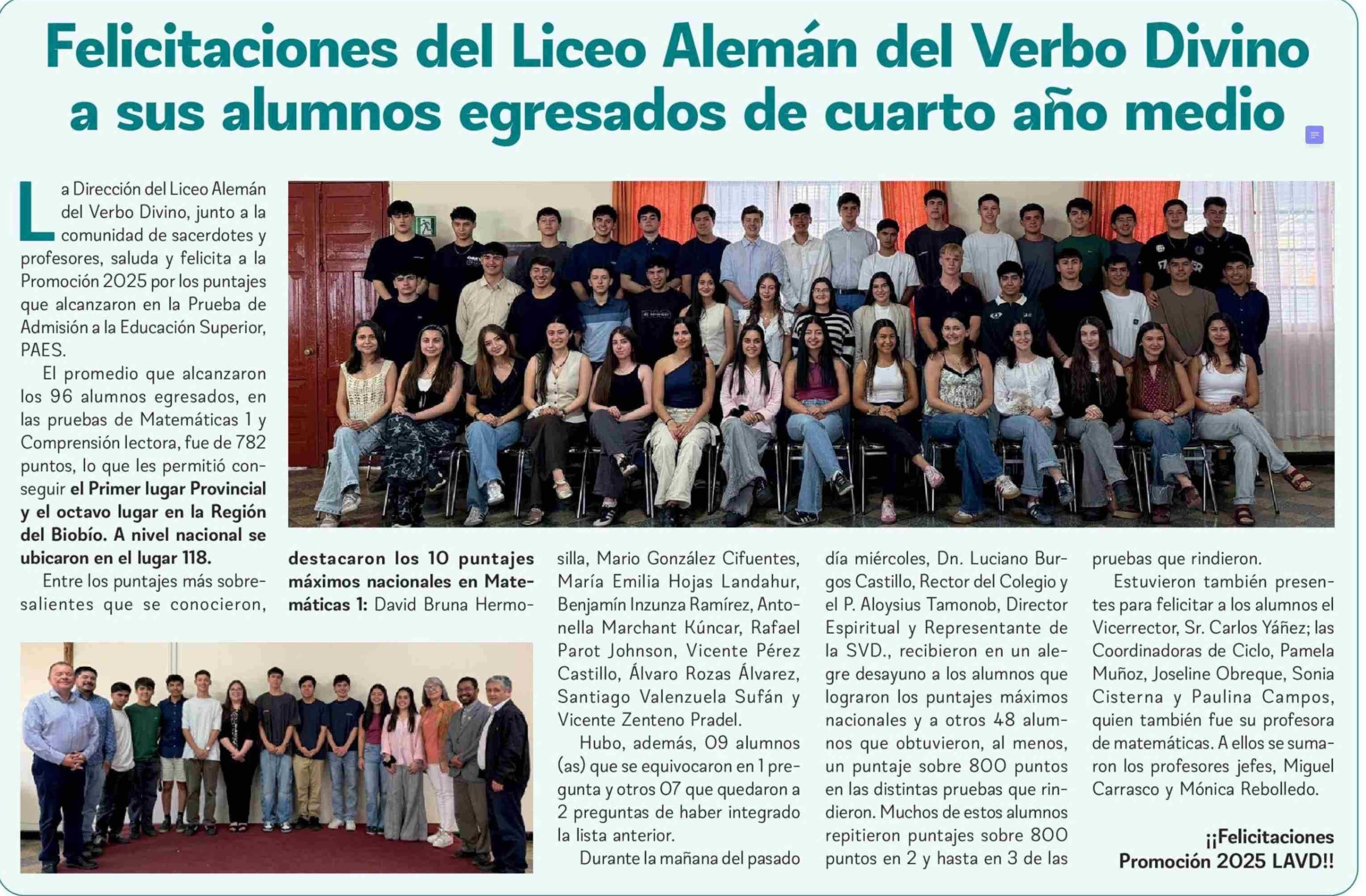 Felicitaciones del Liceo Alemán del Verbo Divino a sus alumnos egresados de cuarto año medio 09-01-2026 La Tribuna |
