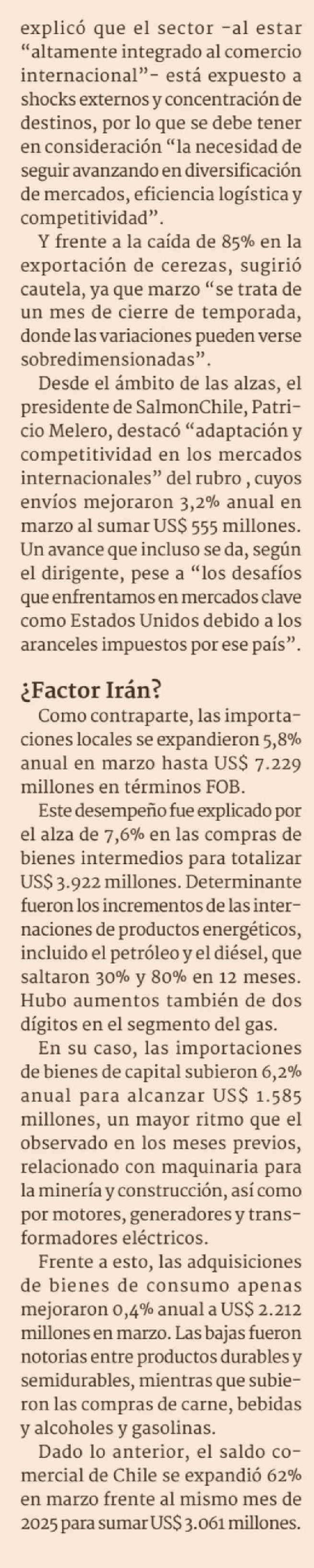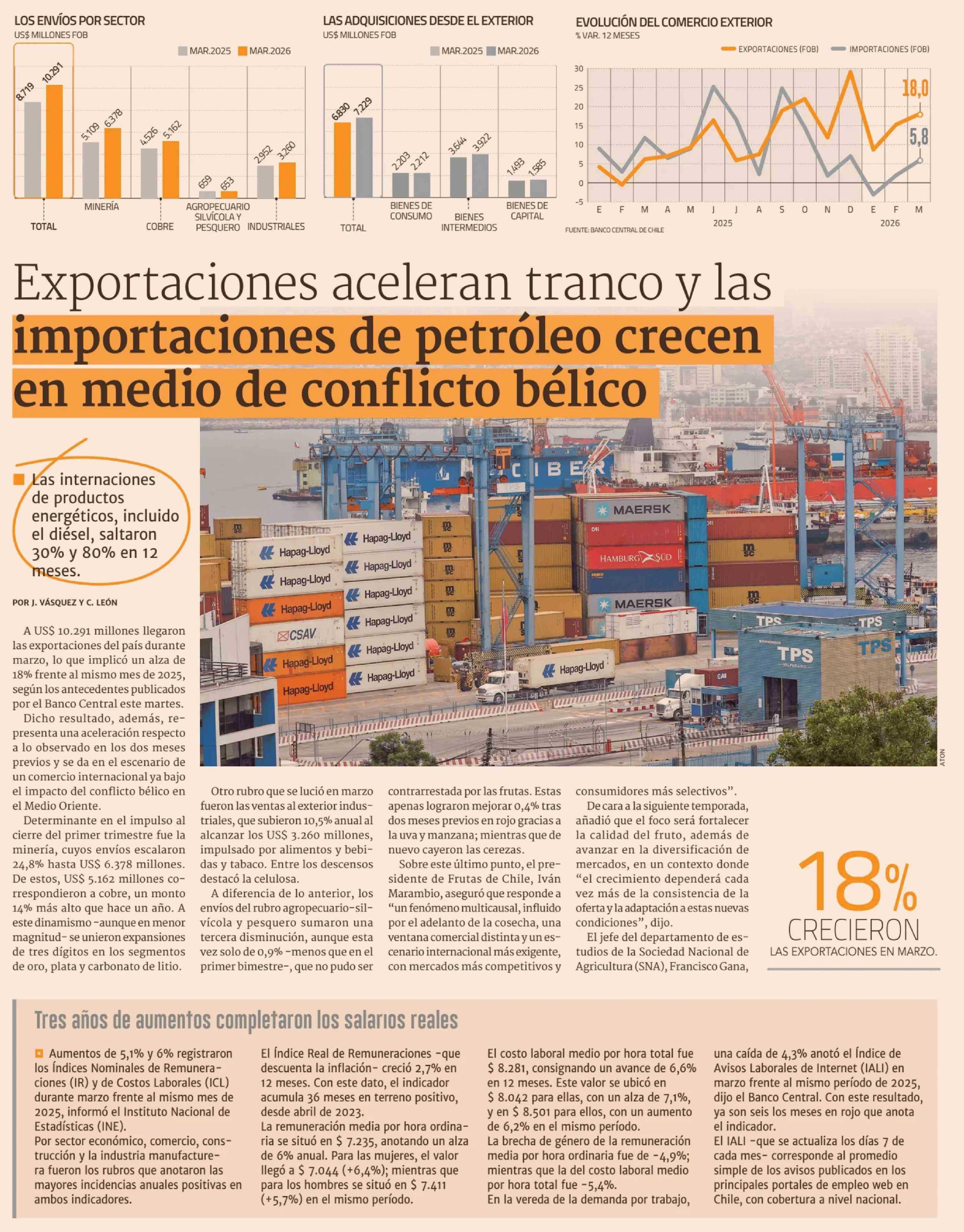 Exportaciones aceleran tranco y las importaciones de petróleo crecen en medio de conflicto bélico 08-04-2026 Diario Financiero |