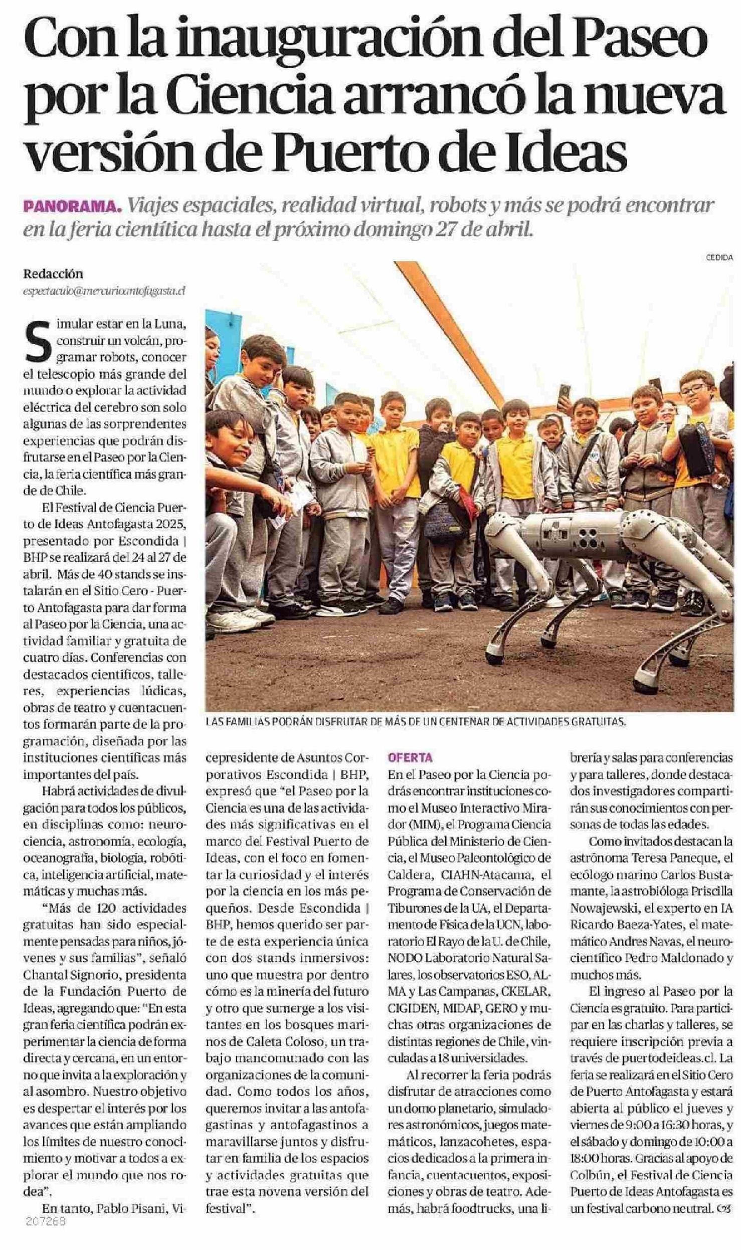 Con la inauguración del Paseo por la Ciencia arrancó la nueva versión de Puerto de Ideas 25-04-2025 El Mercurio de Antofagasta |