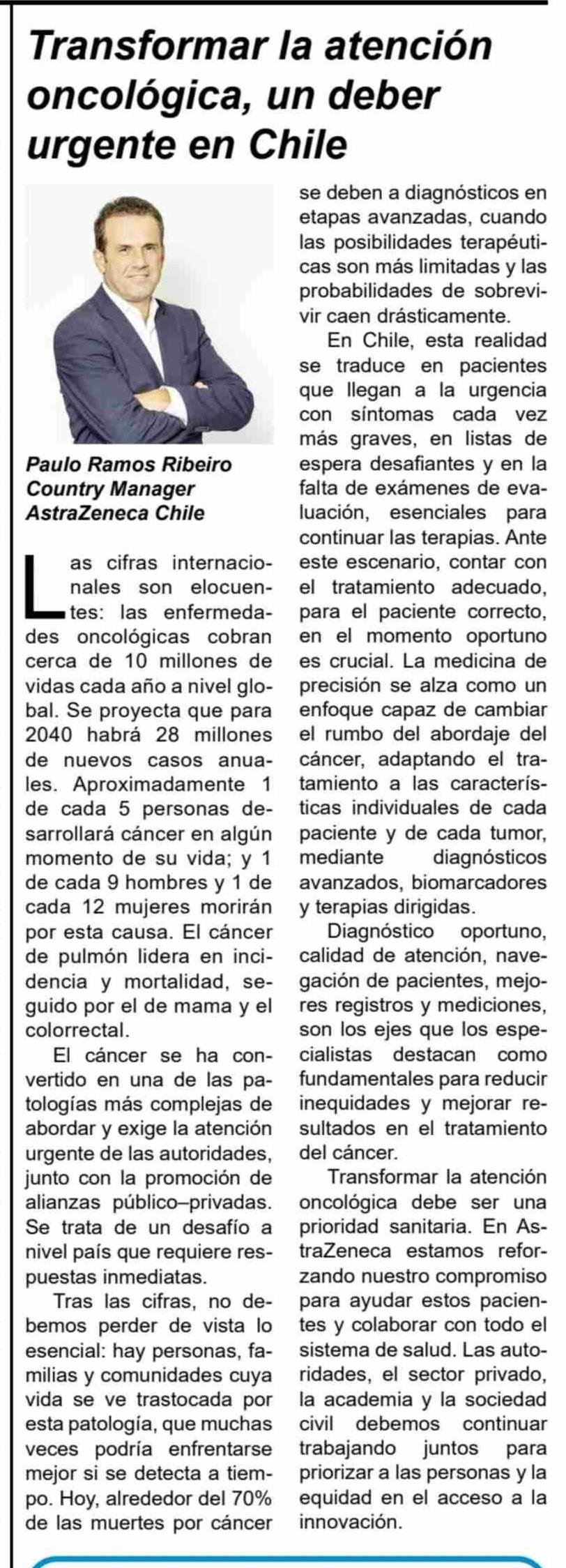 Columnas de Opinión: Transformar la atención oncológica, un deber urgente en Chile 07-02-2026 Diario El Cóndor |