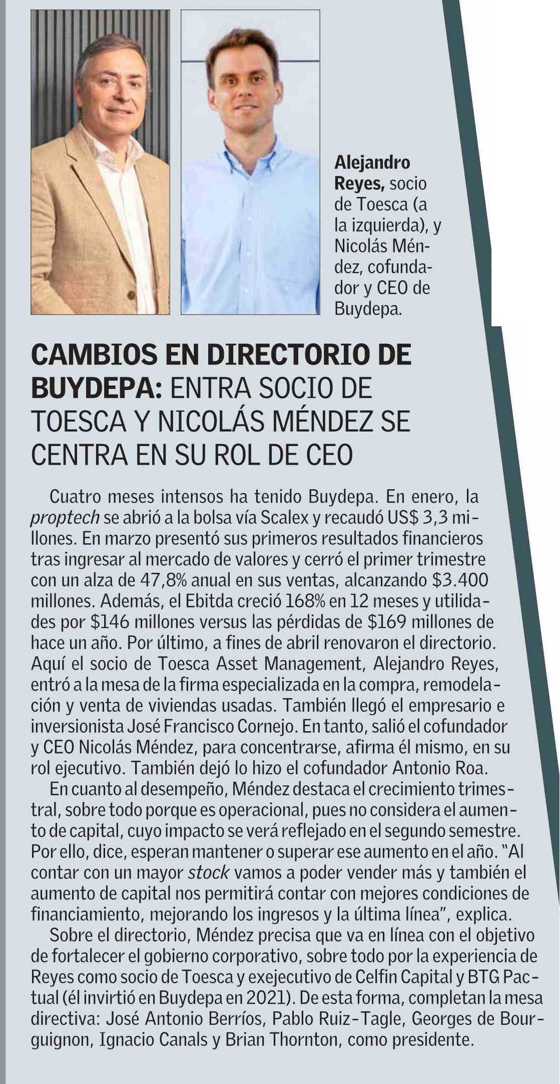 CAMBIOS EN DIRECTORIO DE BUYDEPA: ENTRA SOCIO DE TOESCA Y NICOLÁS MÉNDEZ SE CENTRA EN SU ROL DE CEO 26-05-2025 El Mercurio |