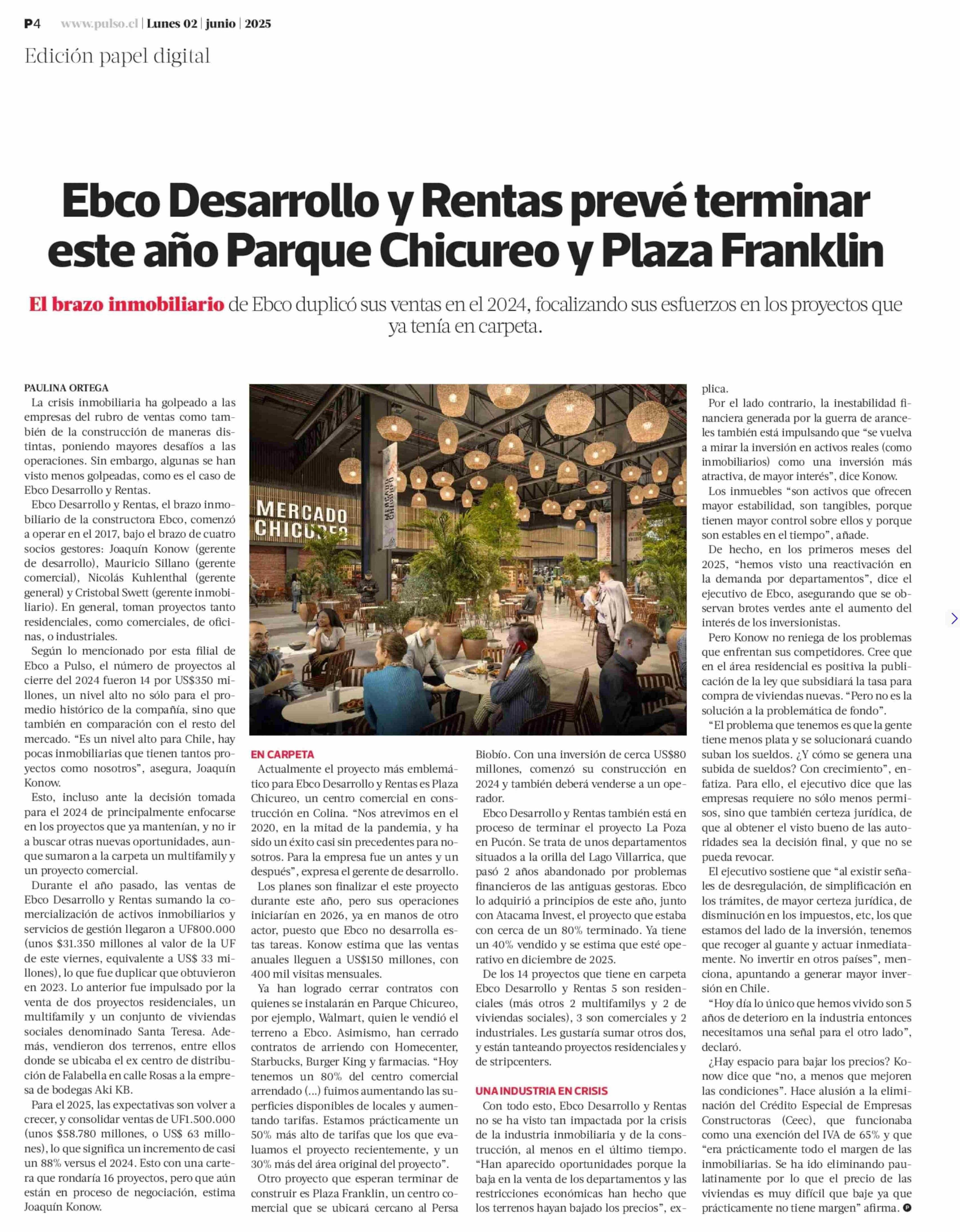 Ebco Desarrollo y Rentas prevé terminar este año Parque Chicureo y Plaza Frankdin 02-06-2025 La Tercera |