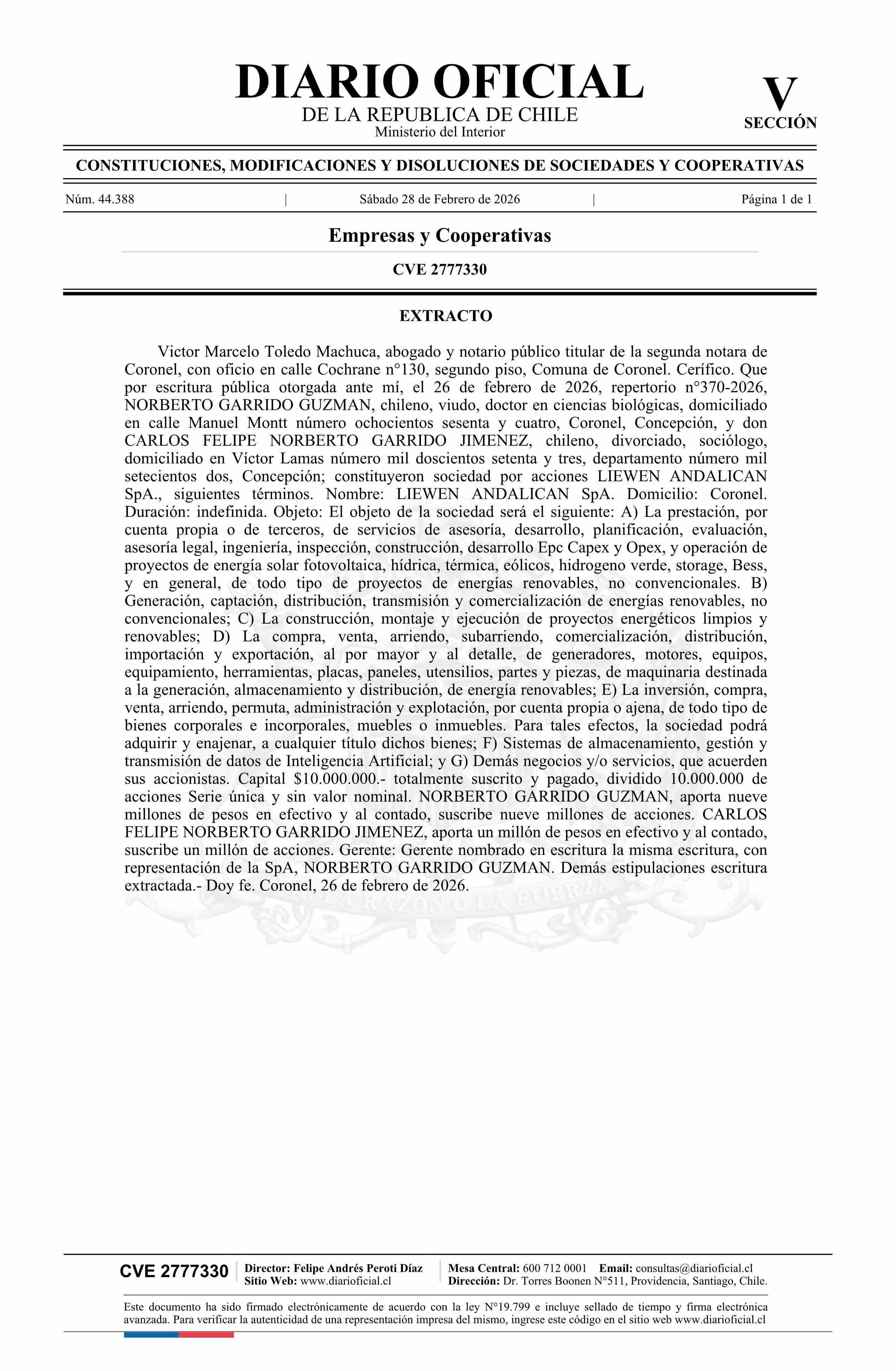 LIEWEN ANDALICAN SpA 28-02-2026 Diario Oficial Edición Electrónica |