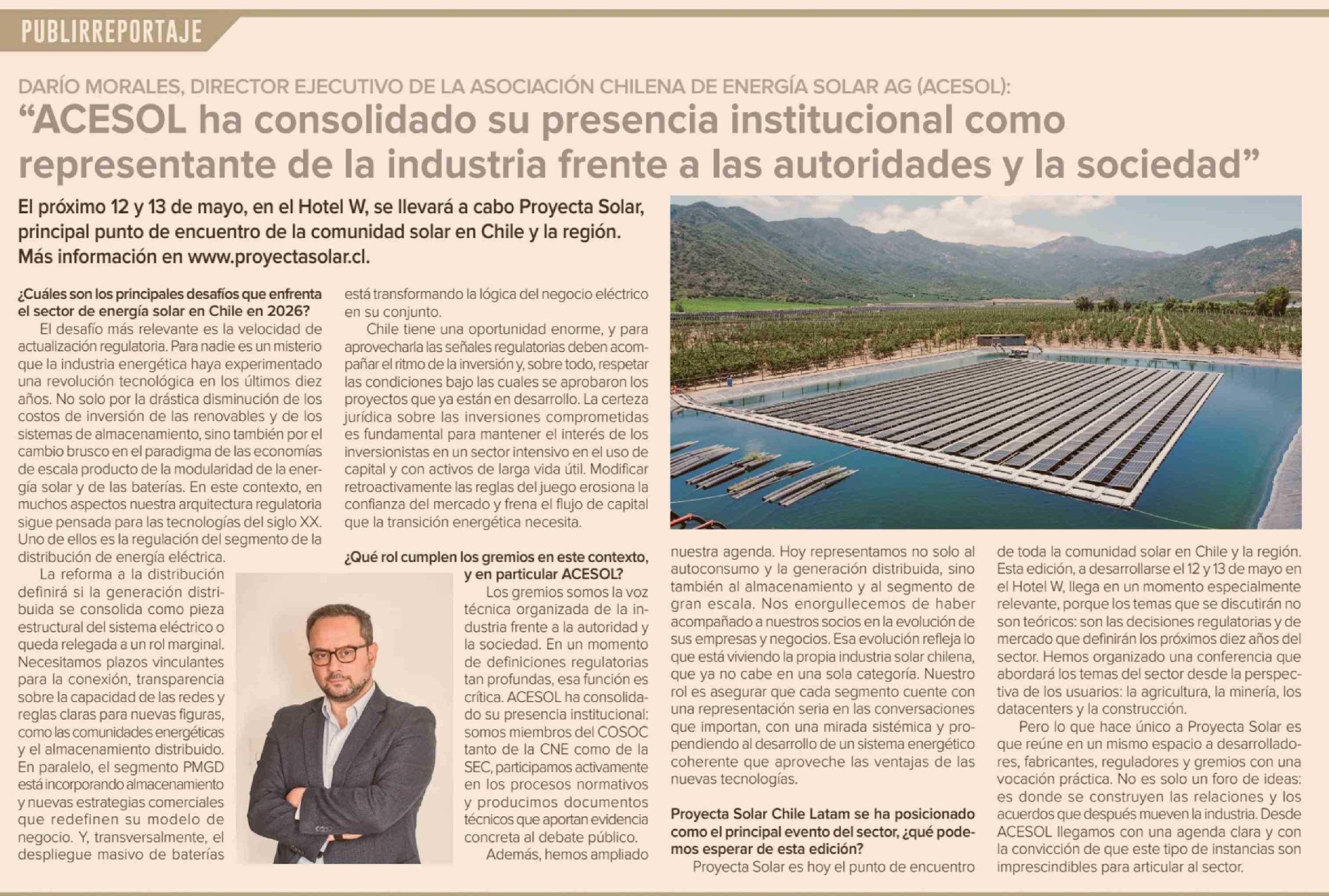 "ACESOL ha consolidado su presencia institucional como representante de la industria frente a las autoridades y la sociedad" 22-04-2026 Diario Financiero |