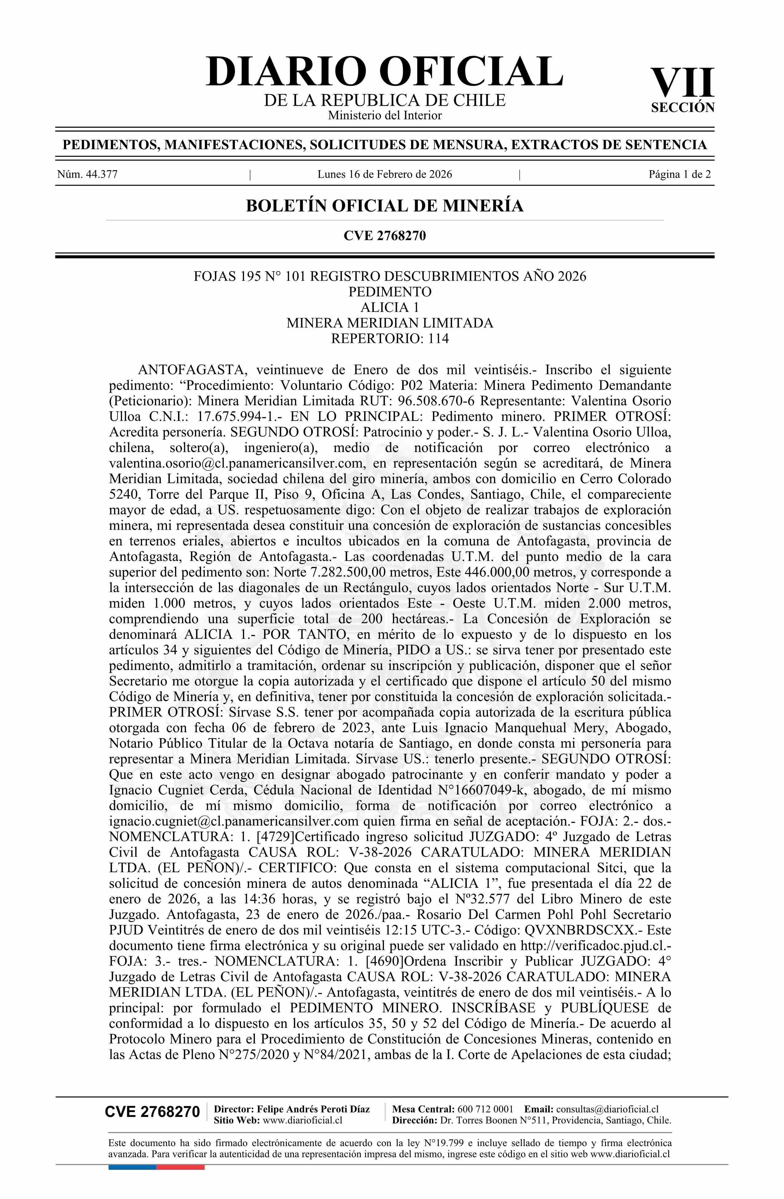 ALICIA 1 / Minera Meridian Limitada 16-02-2026 DIARIO OFICIAL CHILE - BOLETÍN OFICIAL DE MINERÍA |