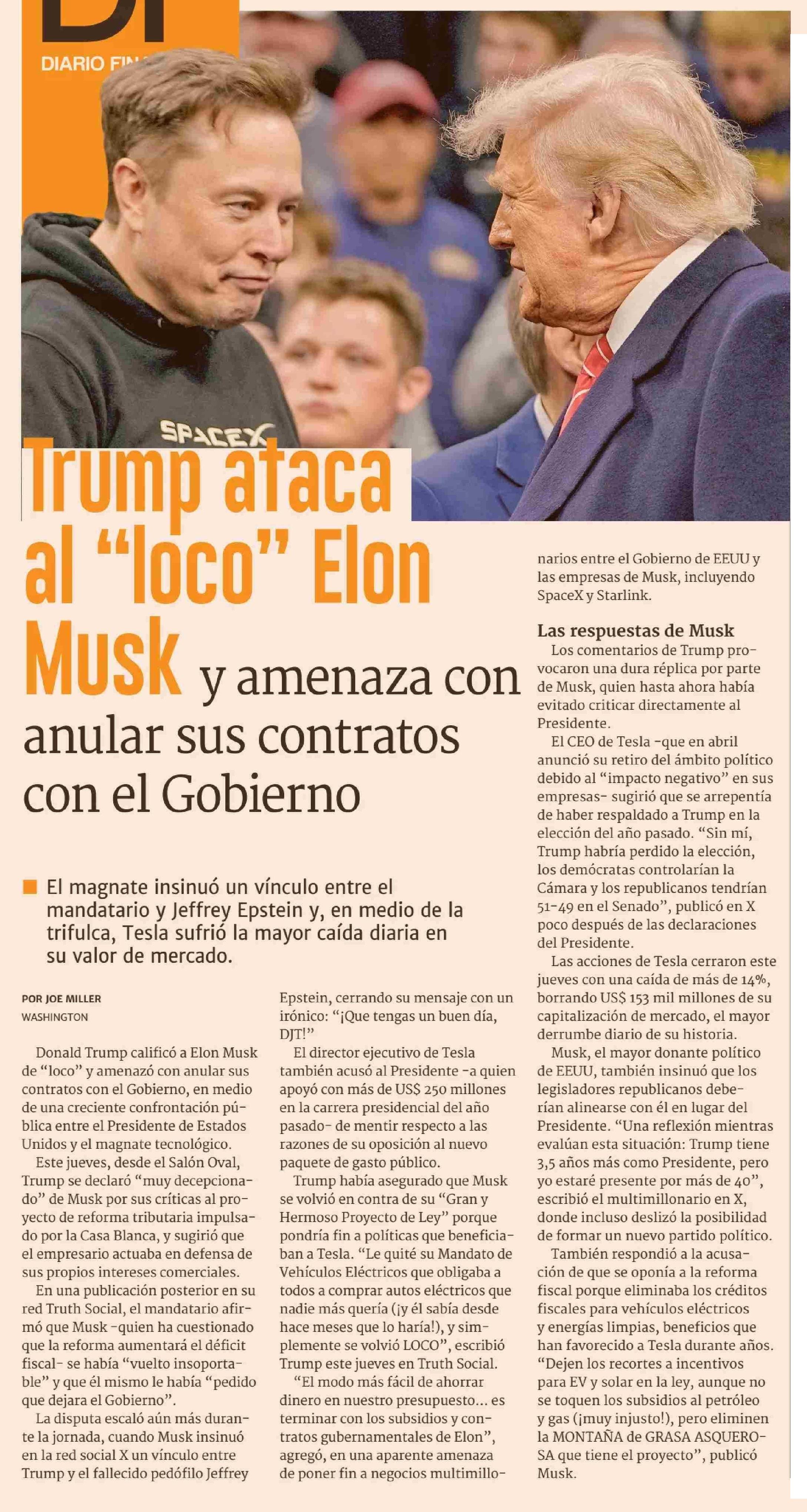 Trump ataca al “loco” Elon Musk y amenaza con anular sus contratos con el Gobierno 06-06-2025 Diario Financiero |