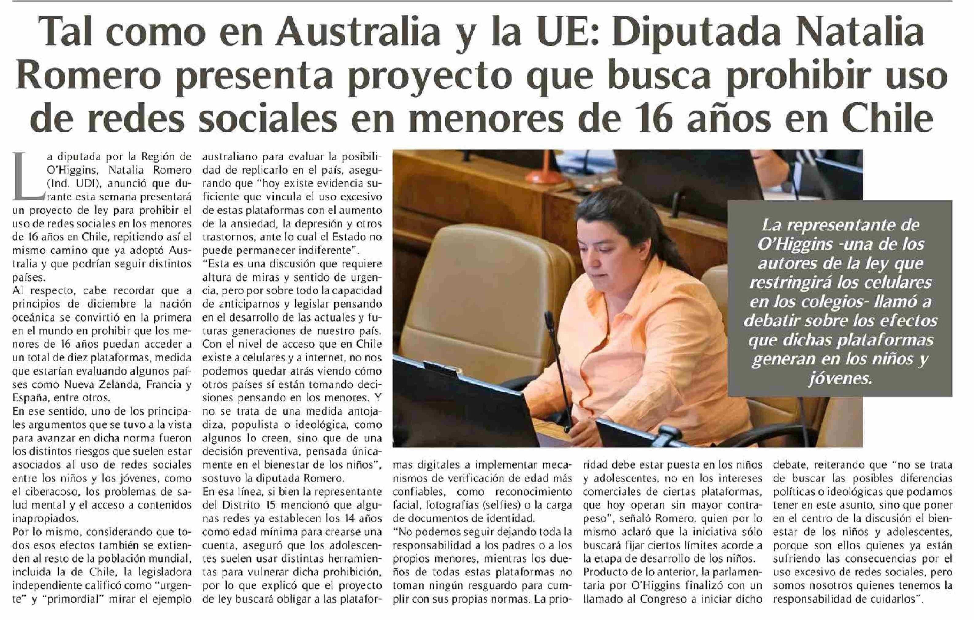 Título: Tal como en Australia y la UE: Diputada Natalia Romero presenta proyecto que busca prohibir uso de redes sociales en menores de 16 años en Chile