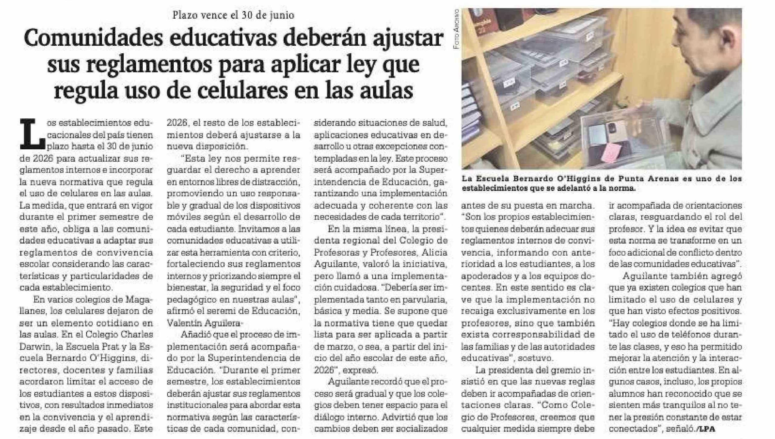 Comunidades educativas deberán ajustar sus reglamentos para aplicar ley que regula uso de celulares en las aulas 10-02-2026 La Prensa Austral |