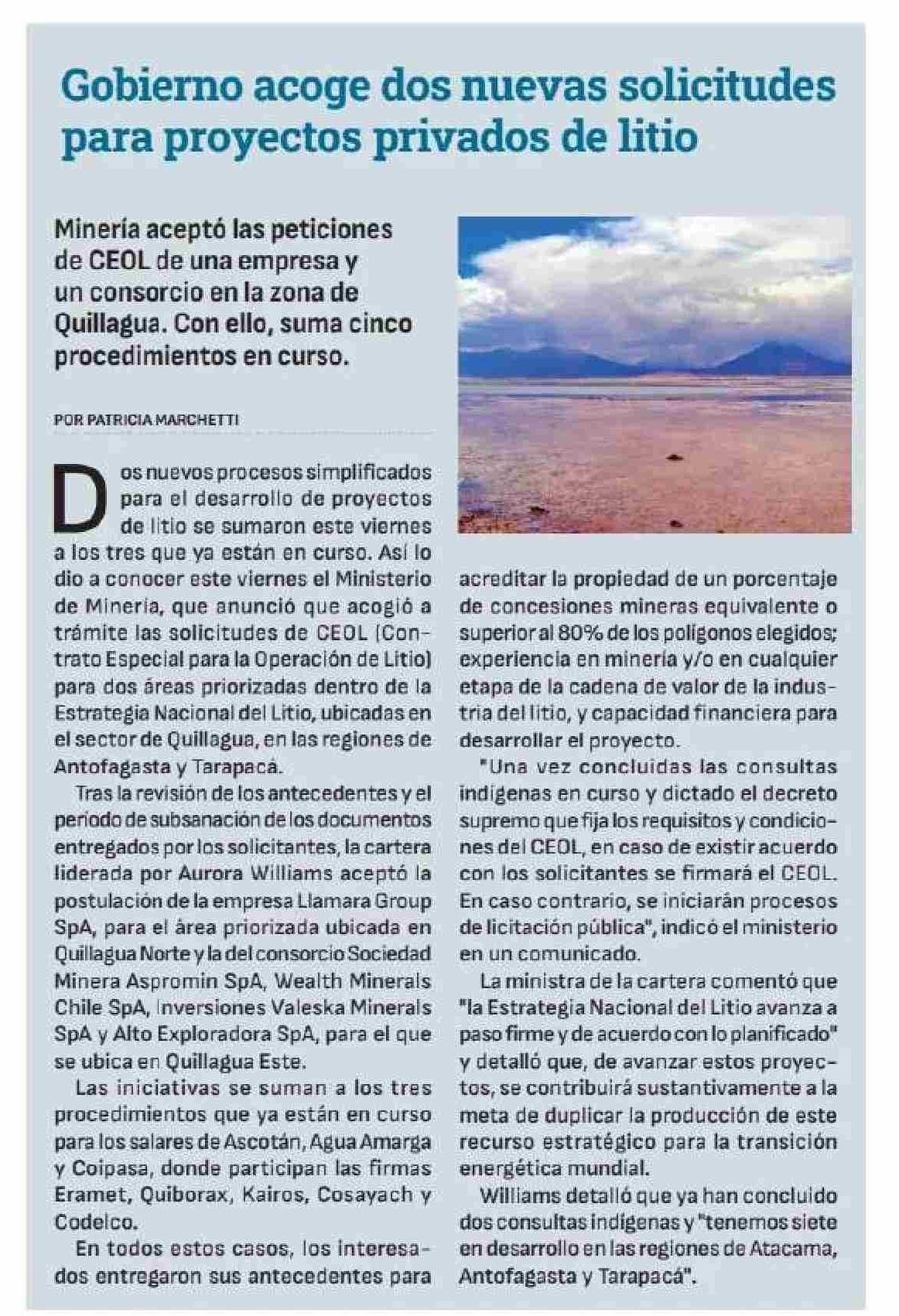 Título: Gobierno acoge dos nuevas solicitudes para proyectos privados de litio