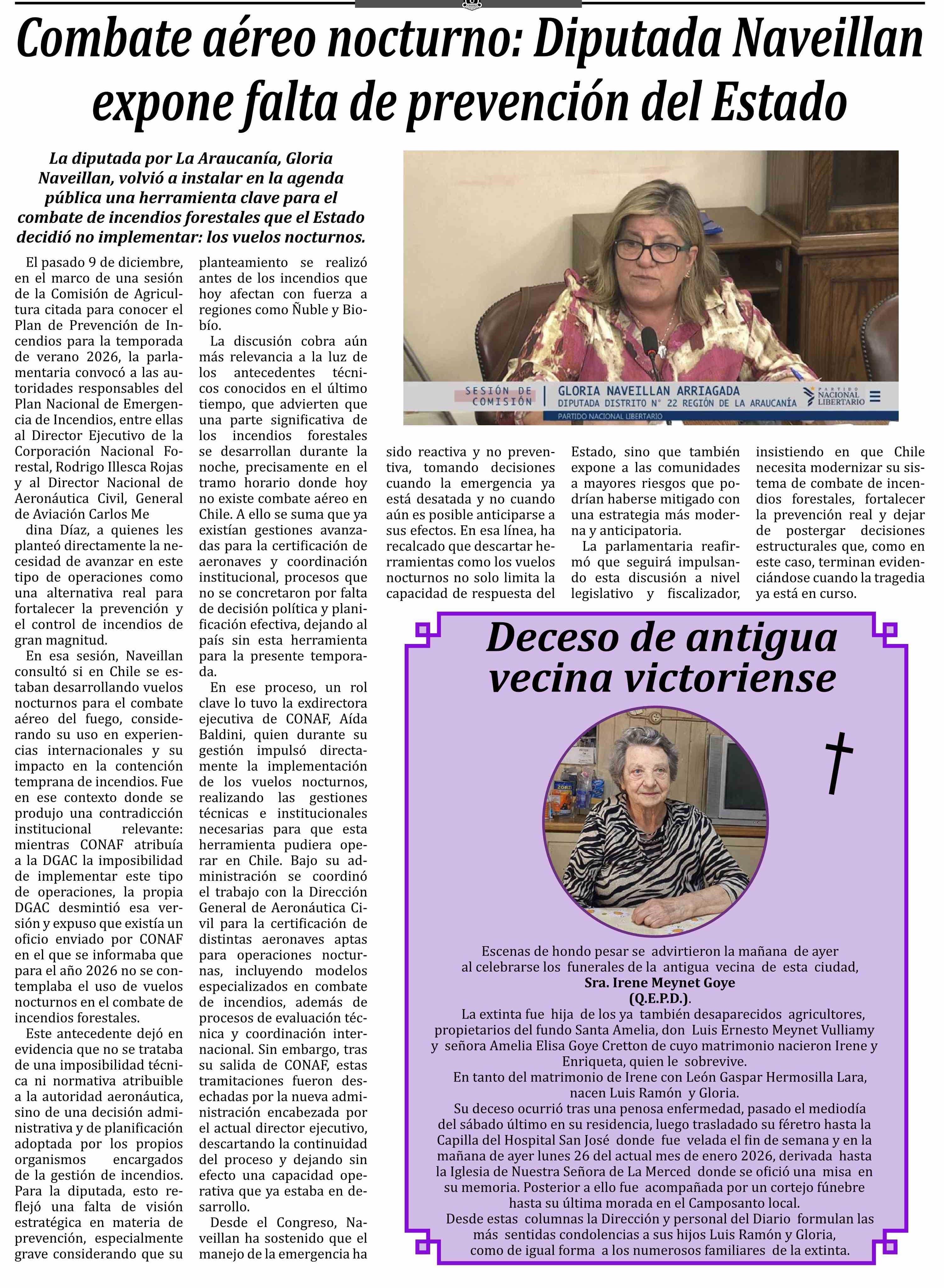 Combate aéreo nocturno: Diputada Naveillan expone falta de prevención del Estado 27-01-2026 Las Noticias |