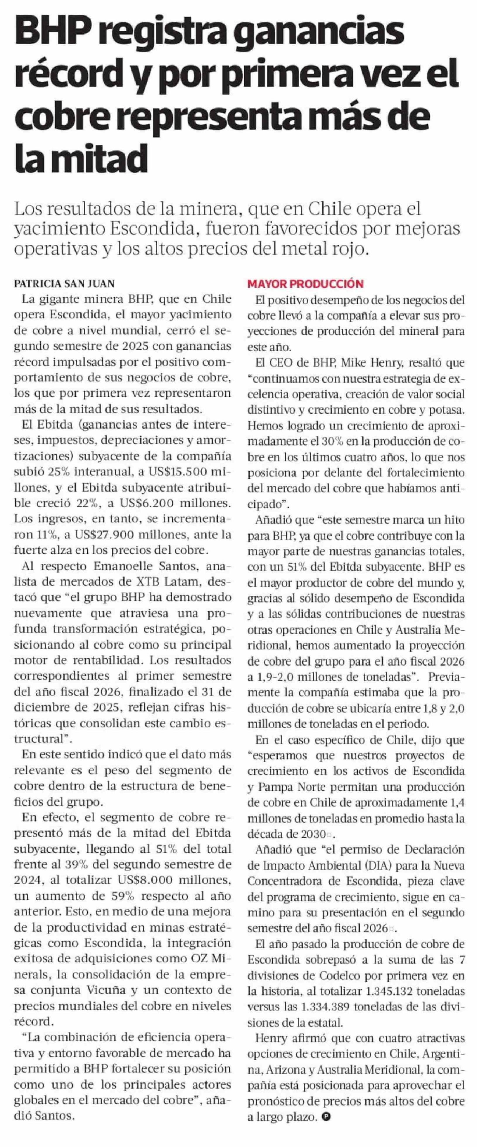 BHP registra ganancias récord y por primera vez el cobre representa más de la mitad 18-02-2026 La Tercera |