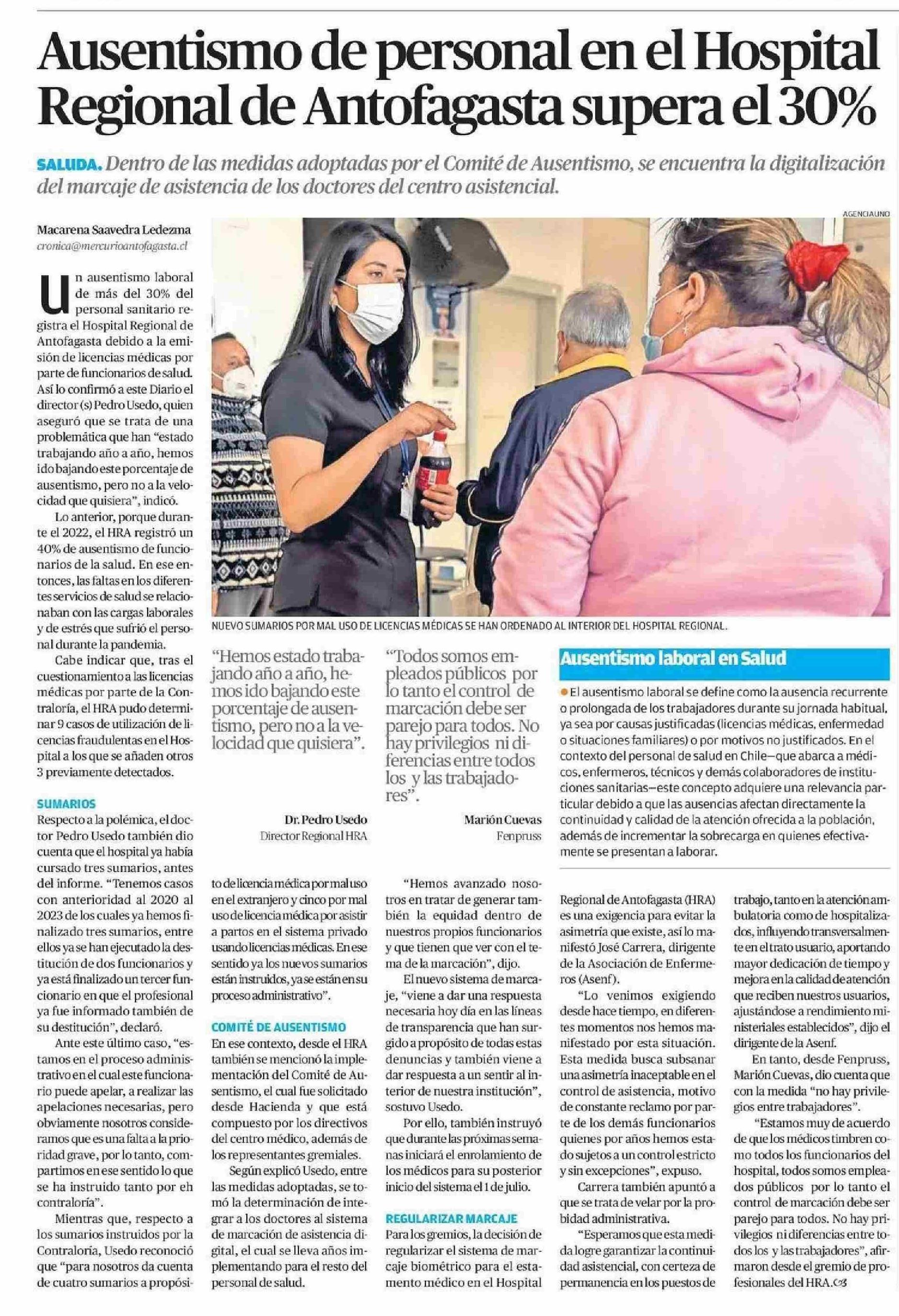 Ausentismo de personal en el Hospital Regional de Antofagasta supera el 30% 03-06-2025 El Mercurio de Antofagasta |