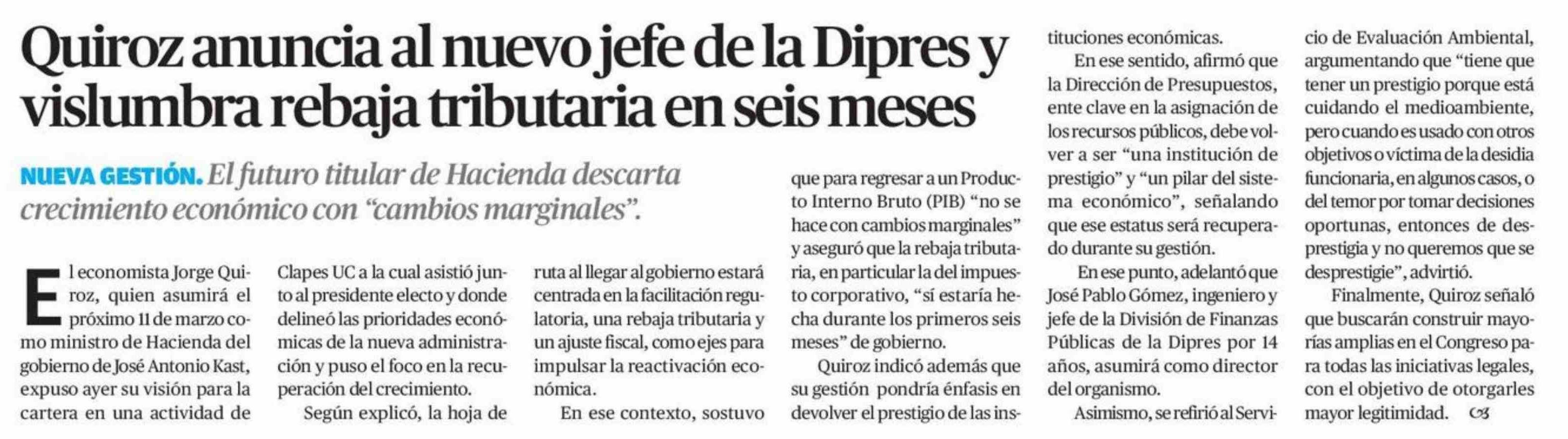 Quiroz anuncia al nuevo jefe de la Dipres y vislumbra rebaja tributaria en seis meses 22-01-2026 El Mercurio de Antofagasta |