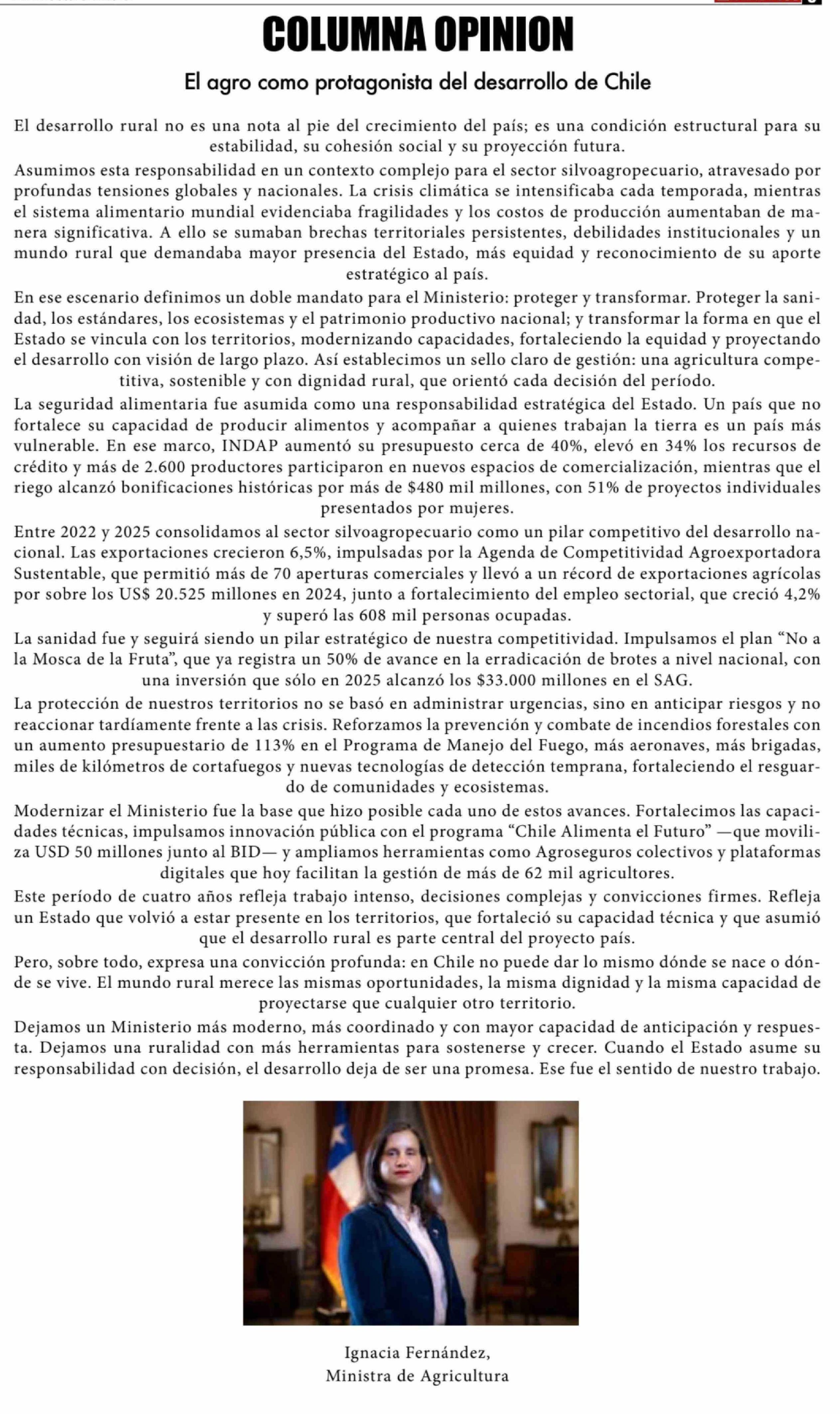 Columnas de Opinión: El agro como protagonista del desarrollo de Chile 21-02-2026 El Lector |