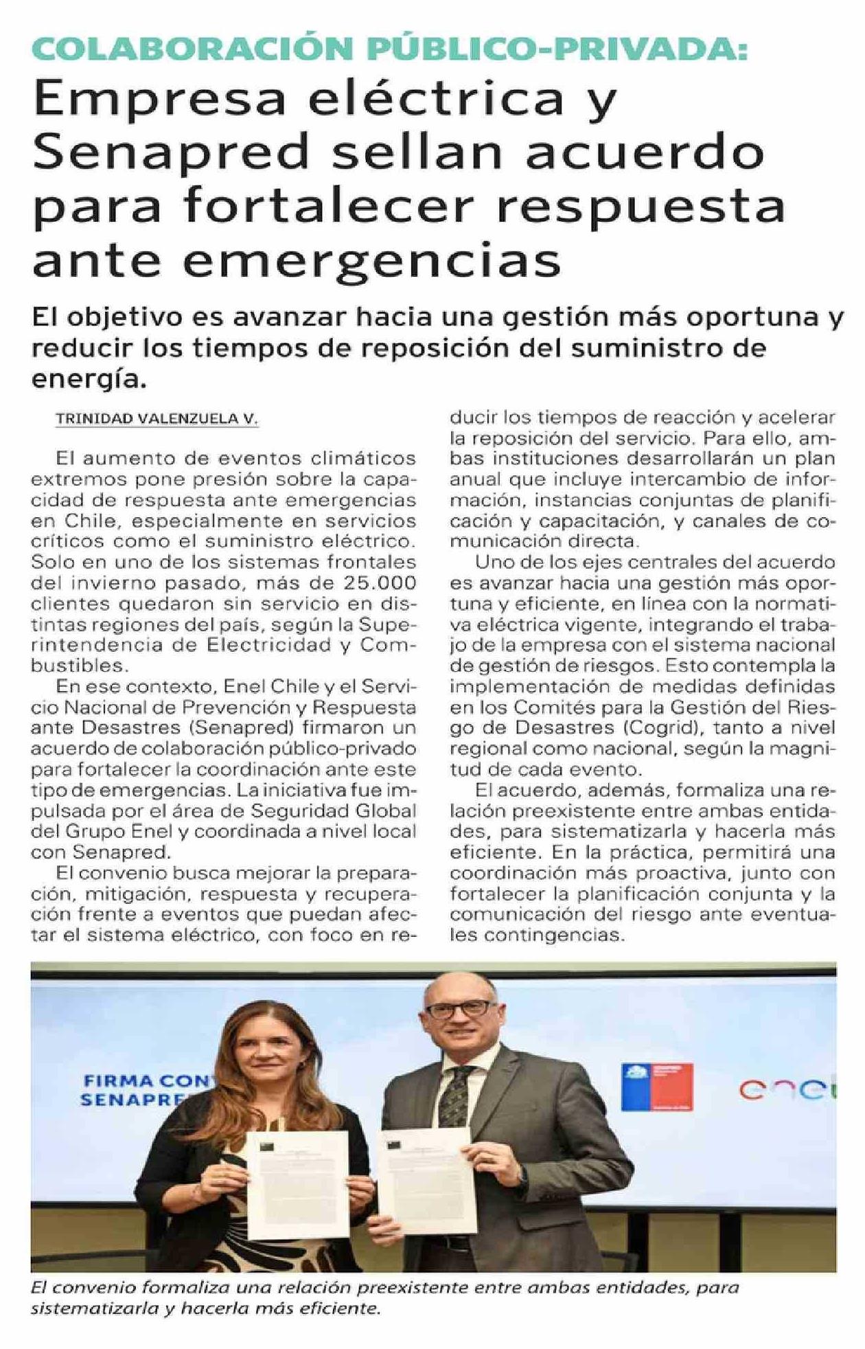 Empresa eléctrica y Senapred sellan acuerdo para fortalecer respuesta ante emergencias 31-03-2026 El Mercurio |