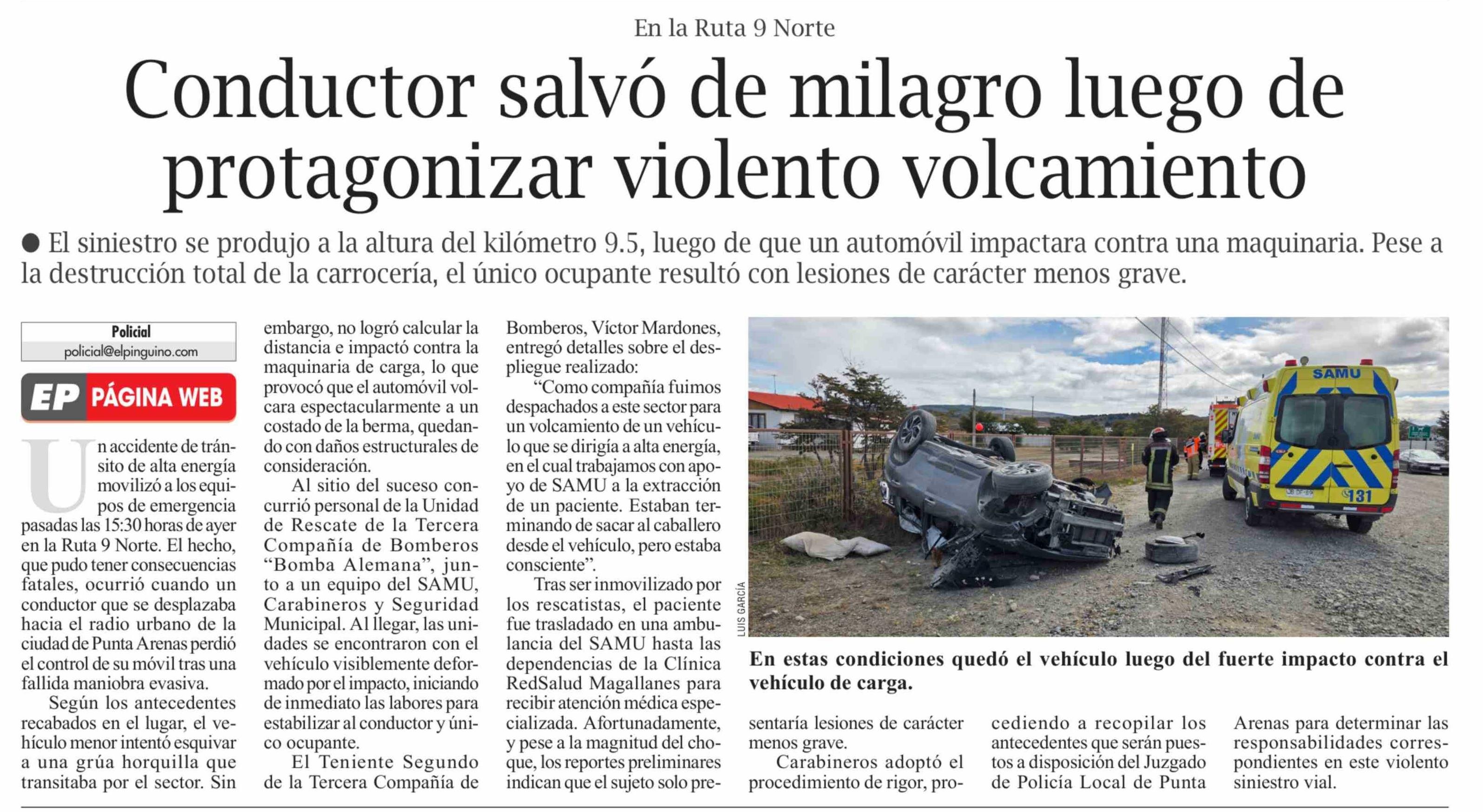 Título: Conductor salvó de milagro luego de protagonizar violento volcamiento
