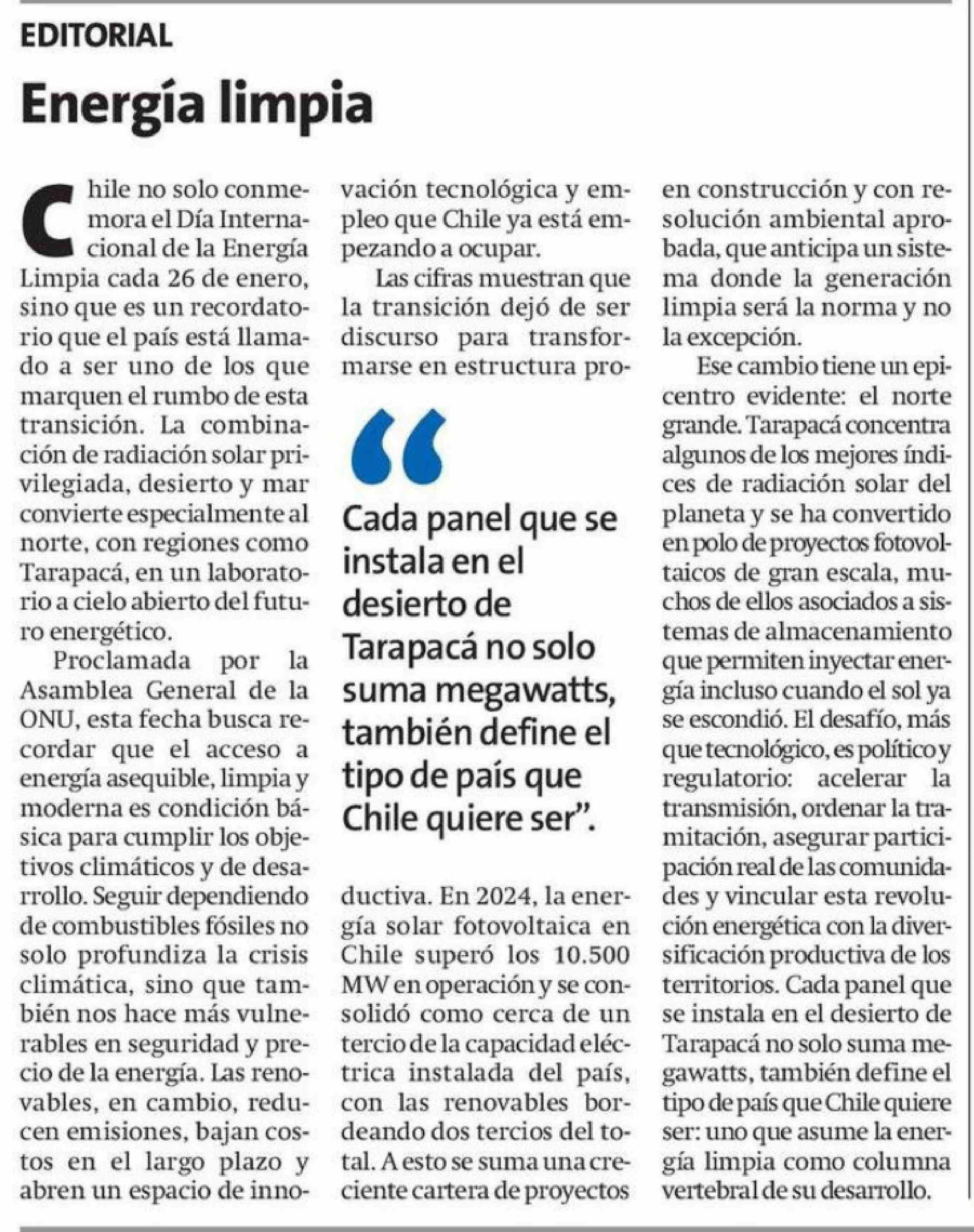 Editorial: Energía limpia 01-02-2026 La Estrella de Iquique |