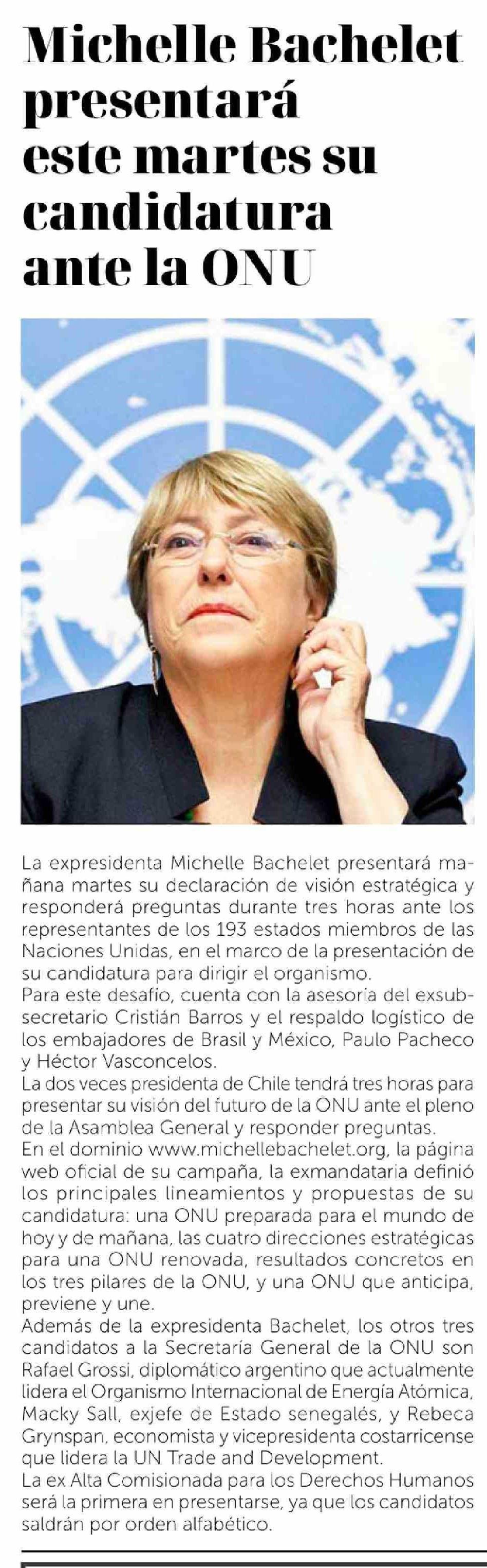 | Título: | Michelle Bachelet presentará este martes su candidatura ante la ONU |