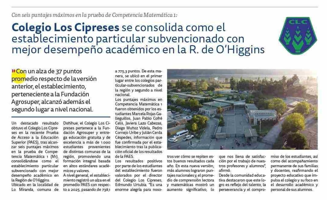 Título: Colegio Los Cipreses se consolida como el establecimiento particular subvencionado con mejor desempeño académico en la R. de O'Higgins
