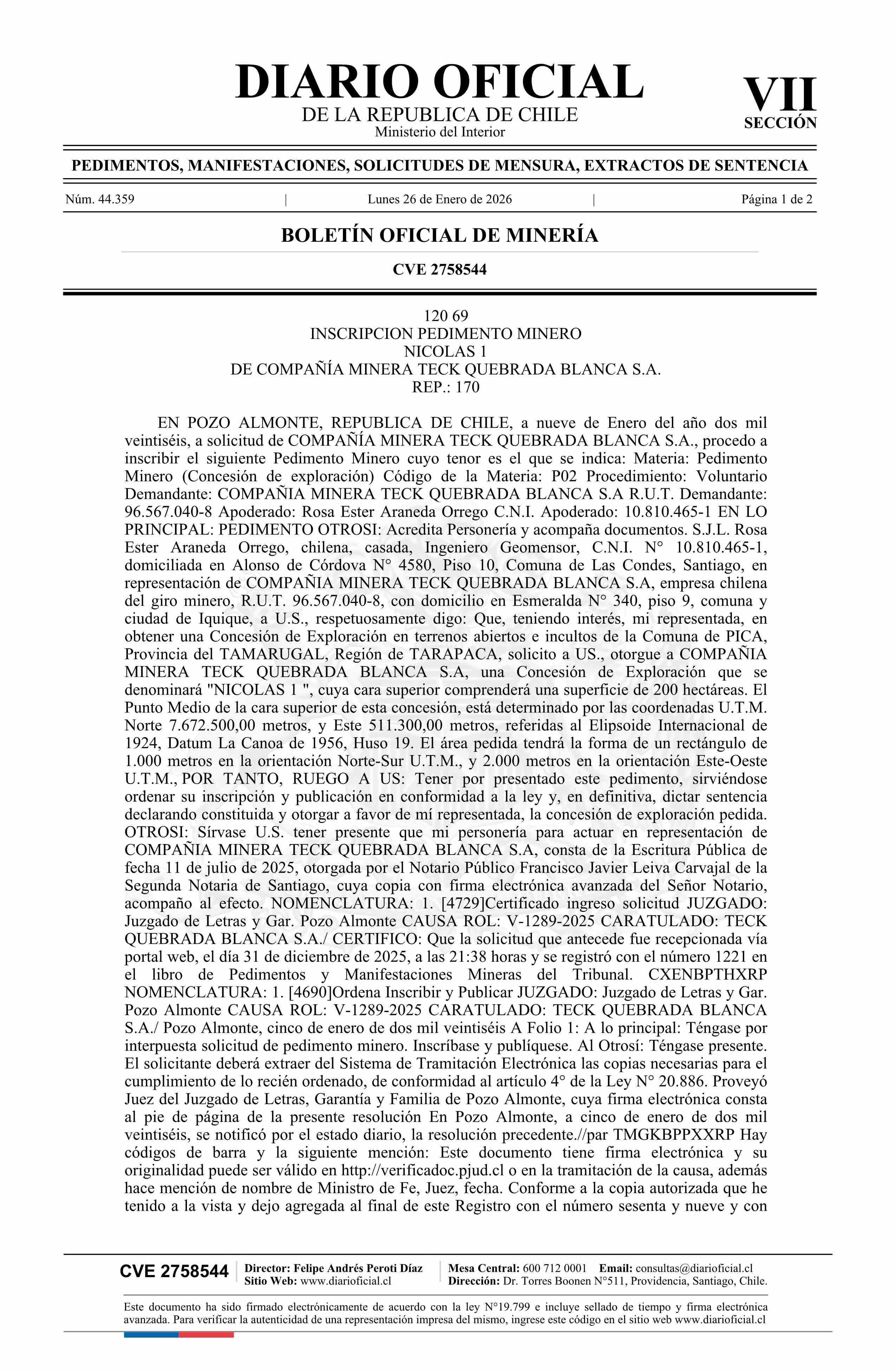 NICOLAS 1 / Compañía Minera Teck Quebrada Blanca S.A.