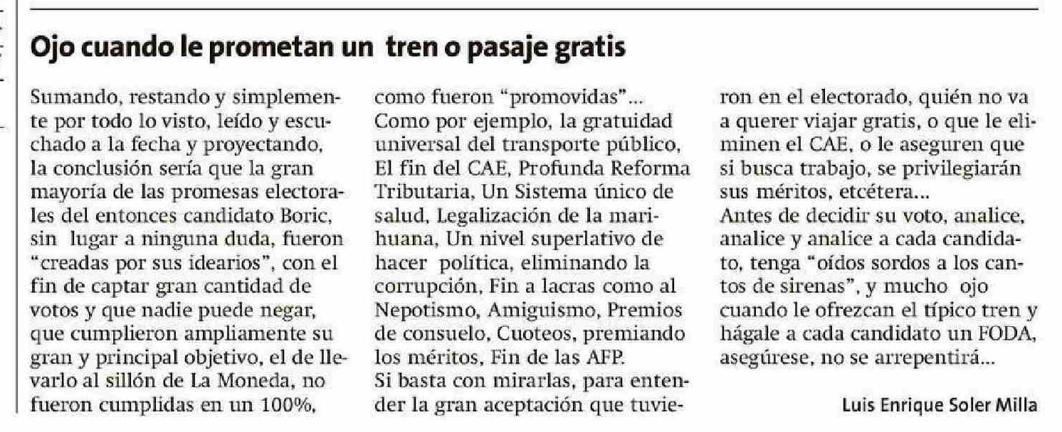 | Título: | Cartas: Ojo cuando le prometan un tren o pasaje gratis |