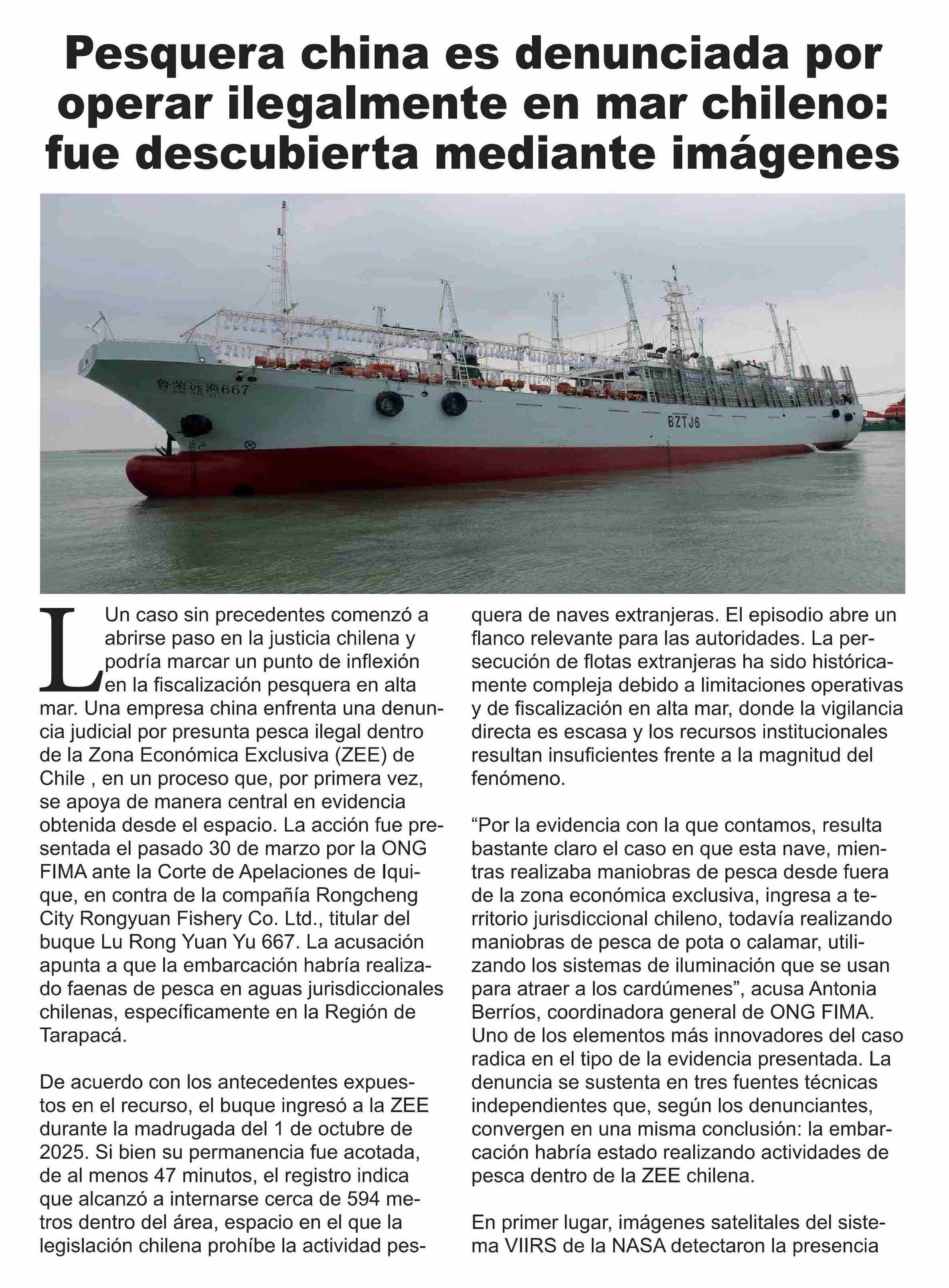 | Título: | Pesquera china es denunciada por operar ilegalmente en mar chileno: fue descubierta mediante imágenes |