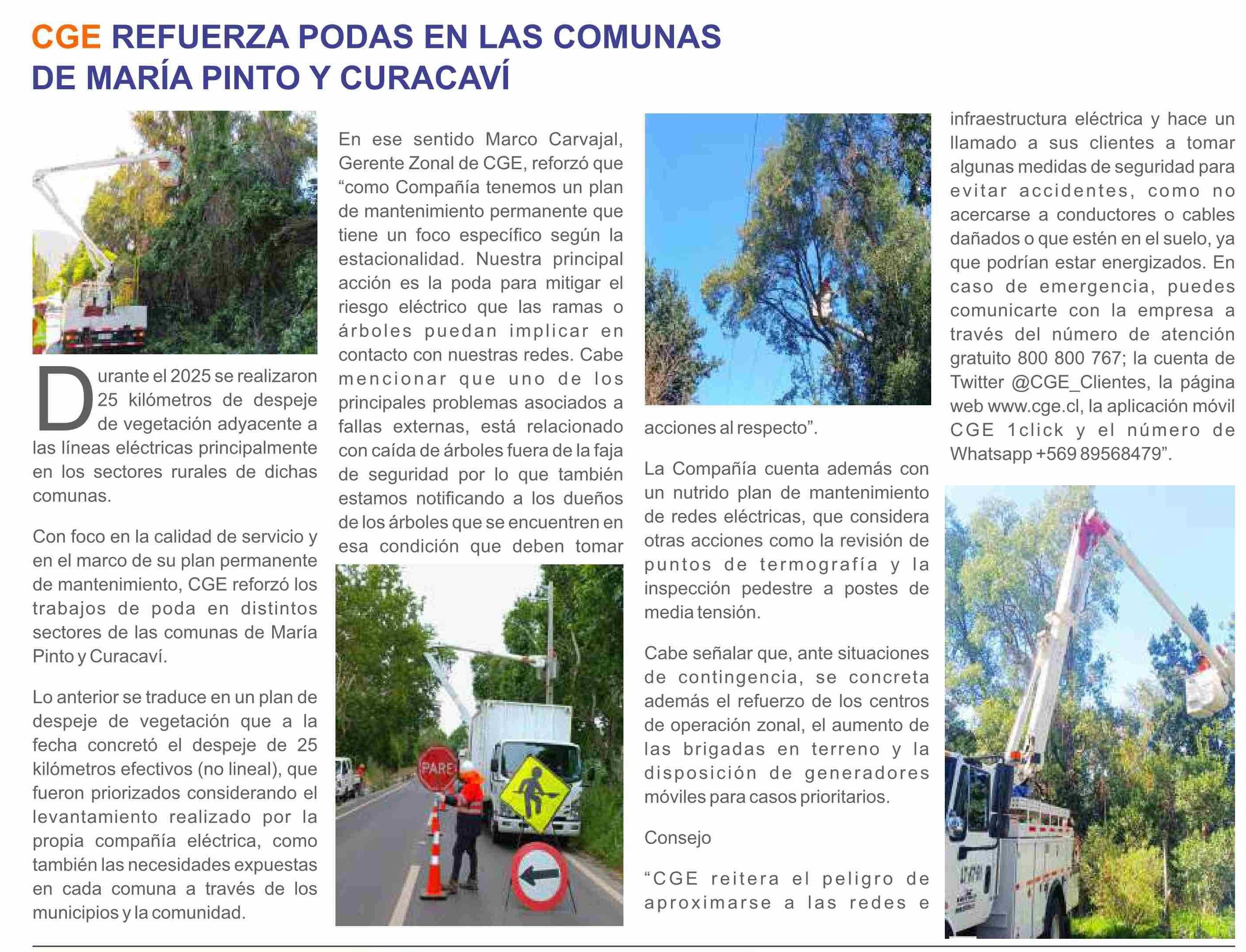 Título: CGE REFUERZA PODAS EN LAS COMUNAS DE MARÍA PINTO Y CURACAVÍ