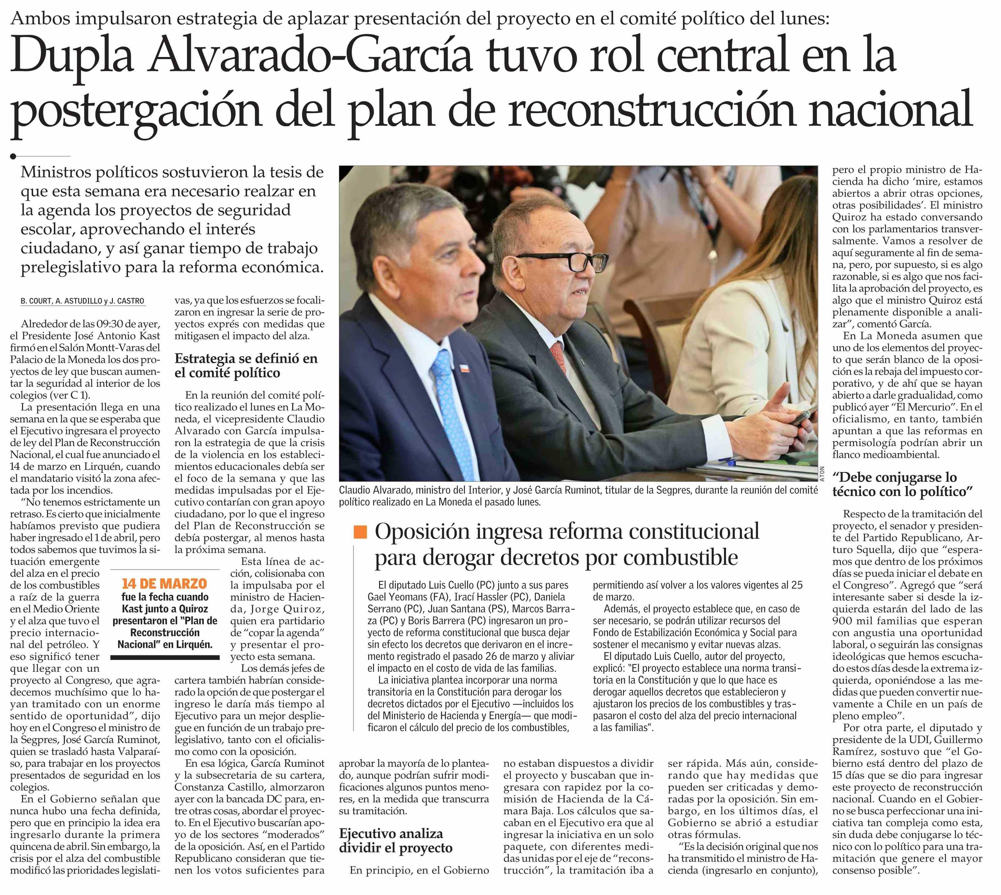 Dupla Alvarado-García tuvo rol central en la postergación del plan de reconstrucción nacional 08-04-2026 El Mercurio |