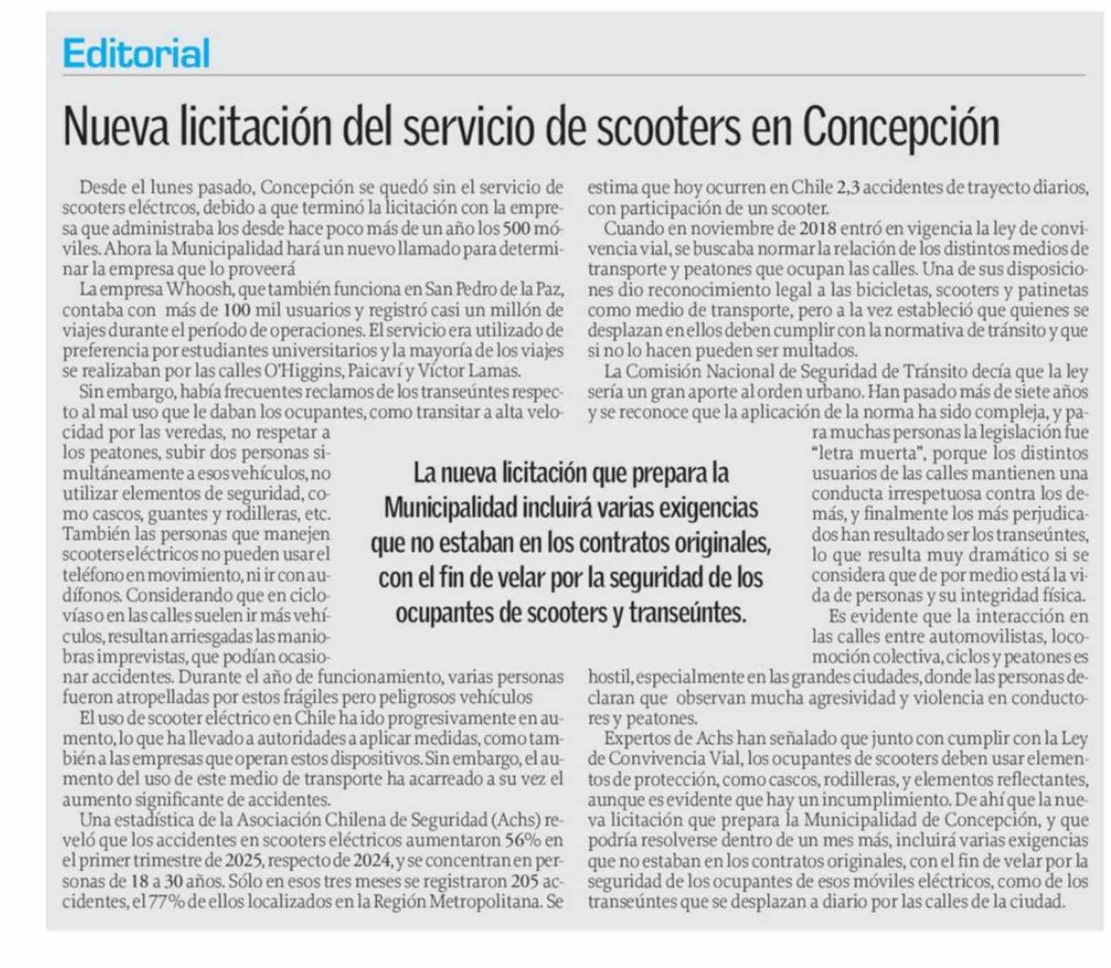 | Título: | EDITORIAL: Nueva licitación del servicio de scooters en Concepción |