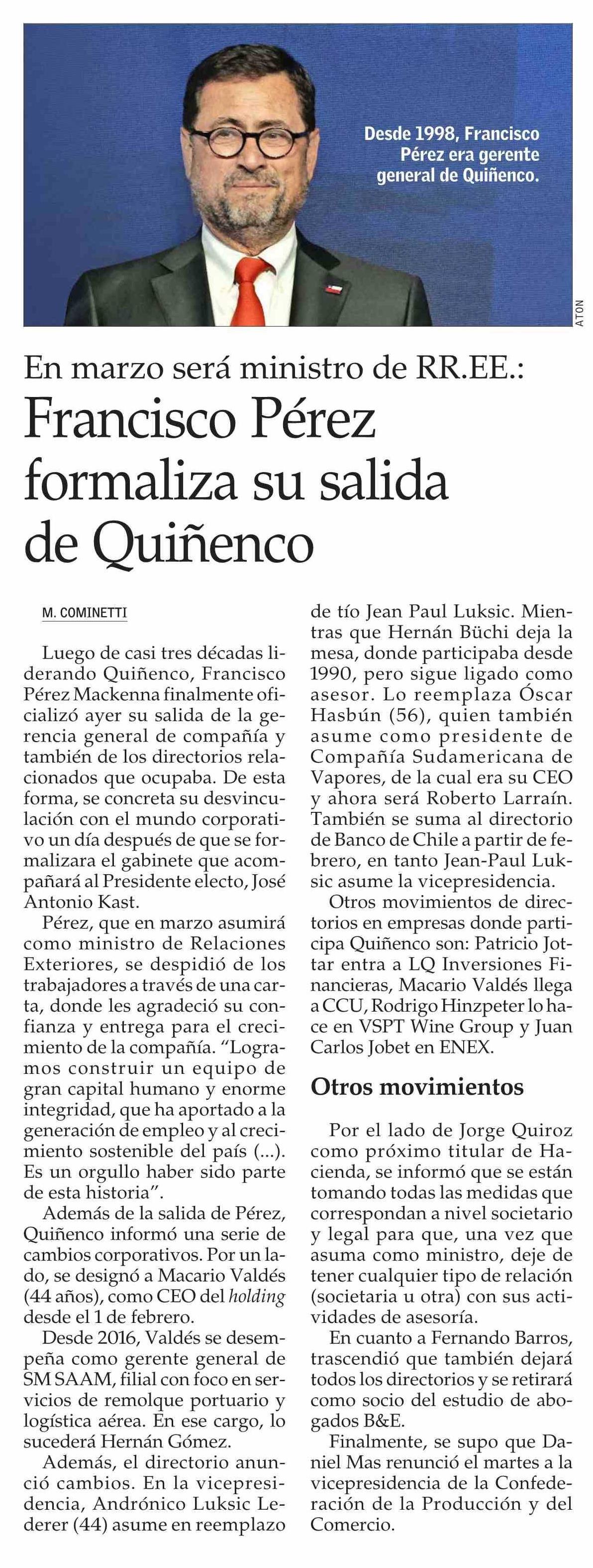 Título: Francisco Pérez formaliza su salida de Quiñenco