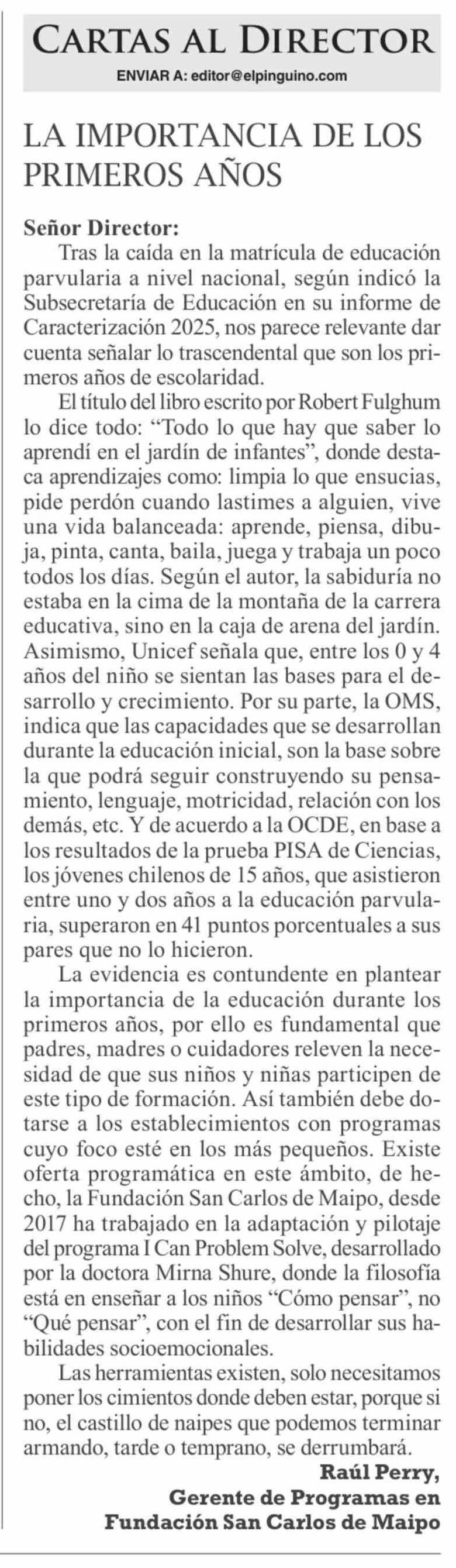 Cartas: LA IMPORTANCIA DE LOS PRIMEROS AÑOS 16-02-2026 El Pingüino |