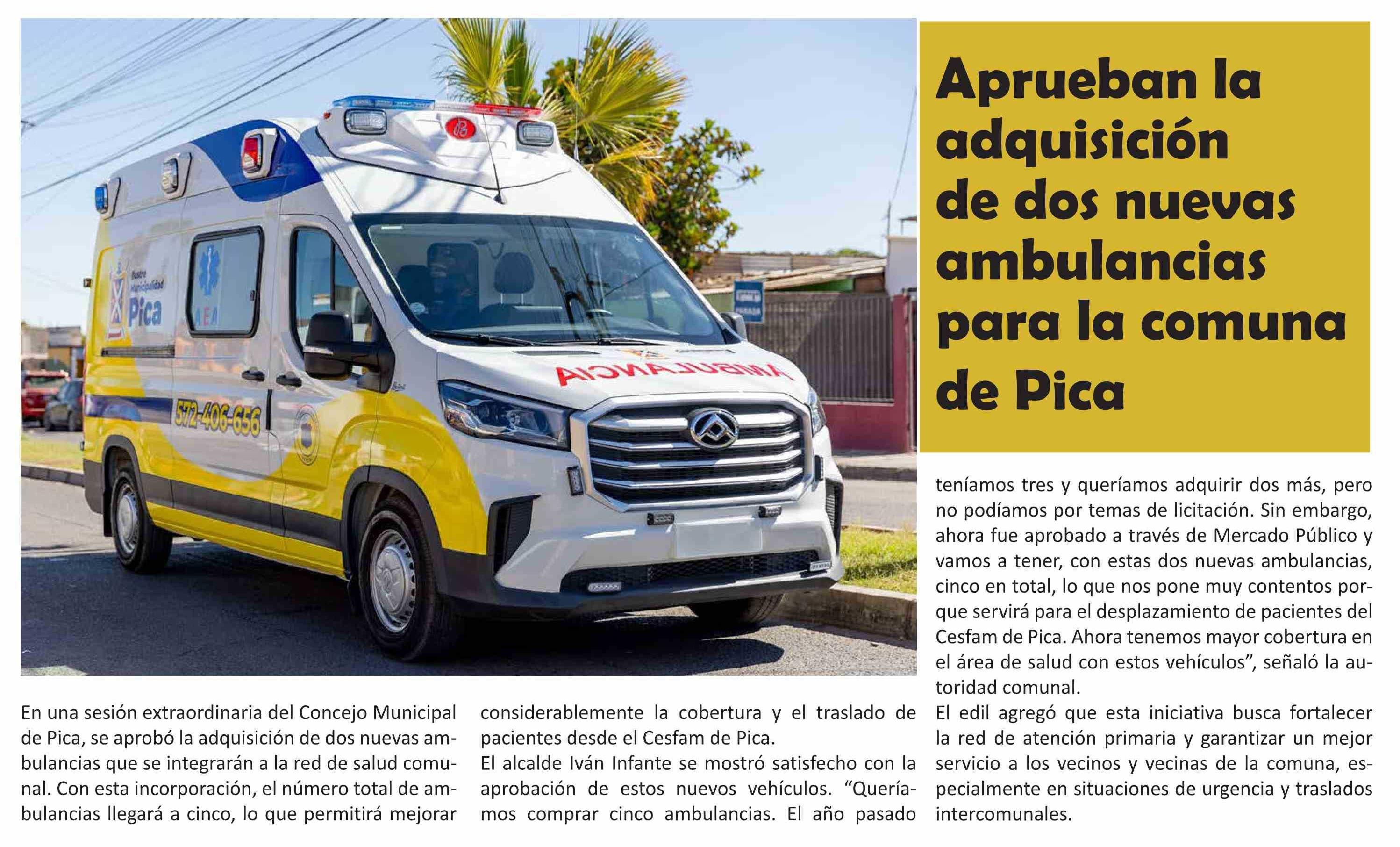 | Título: | En una sesión extraordinaria del Concejo Municipal de Pica, se aprobó la adquisición de dos nuevas ambulancias que se integrarán a la red de salud comunal. Con esta incorporación, el número total de ambulancias llegará a cinco, lo que permitirá mejorar |