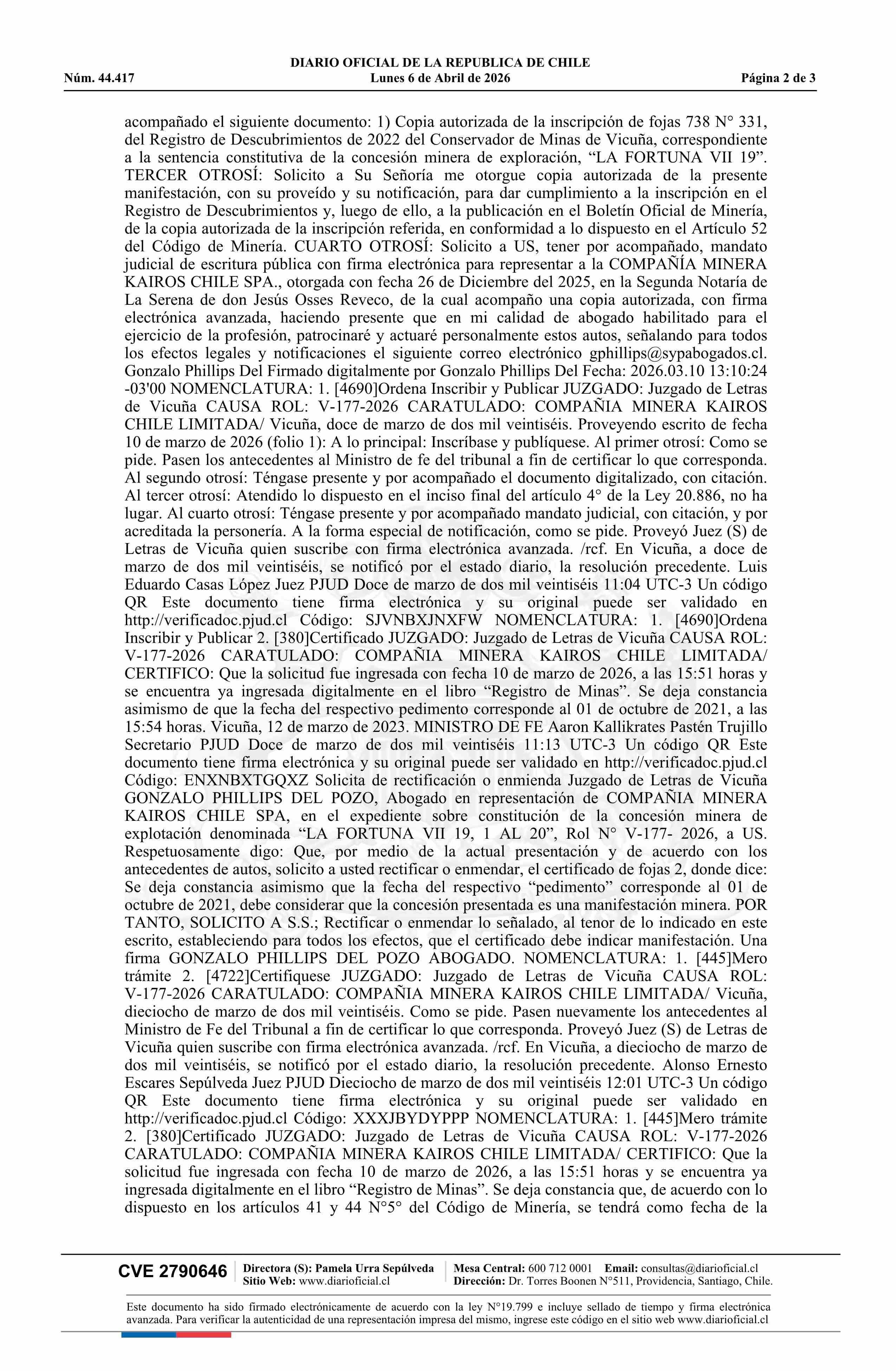 LA FORTUNA VII 19, 1 AL 20 / Compañía Minera Kairos Chile SpA 06-04-2026 DIARIO OFICIAL CHILE - BOLETÍN OFICIAL DE MINERÍA |