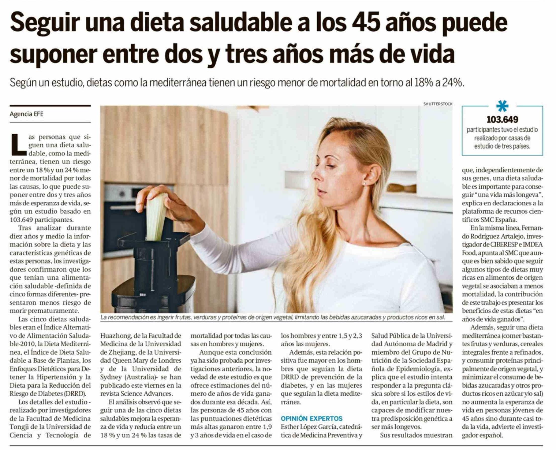 Título: Seguir una dieta saludable a los 45 años puede suponer entre dos y tres años más de vida