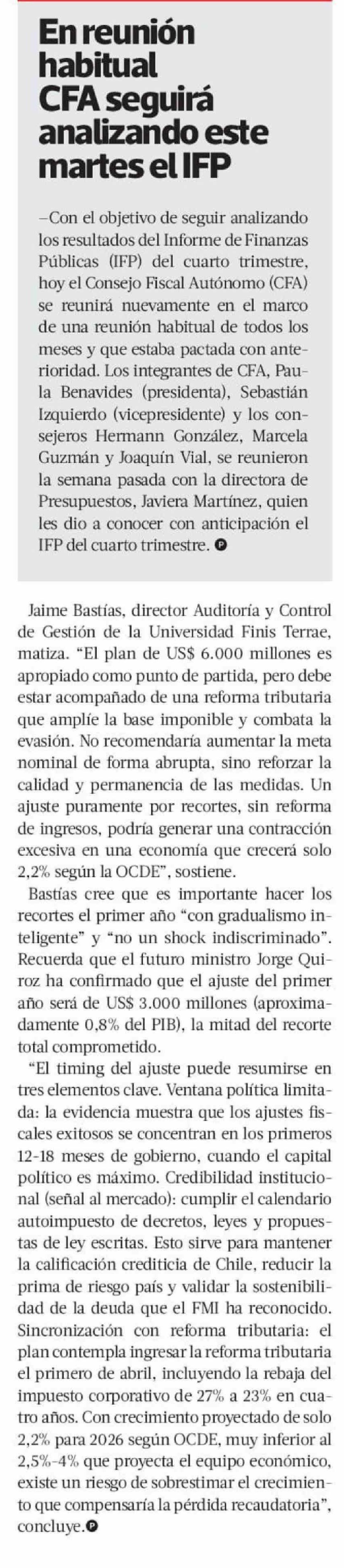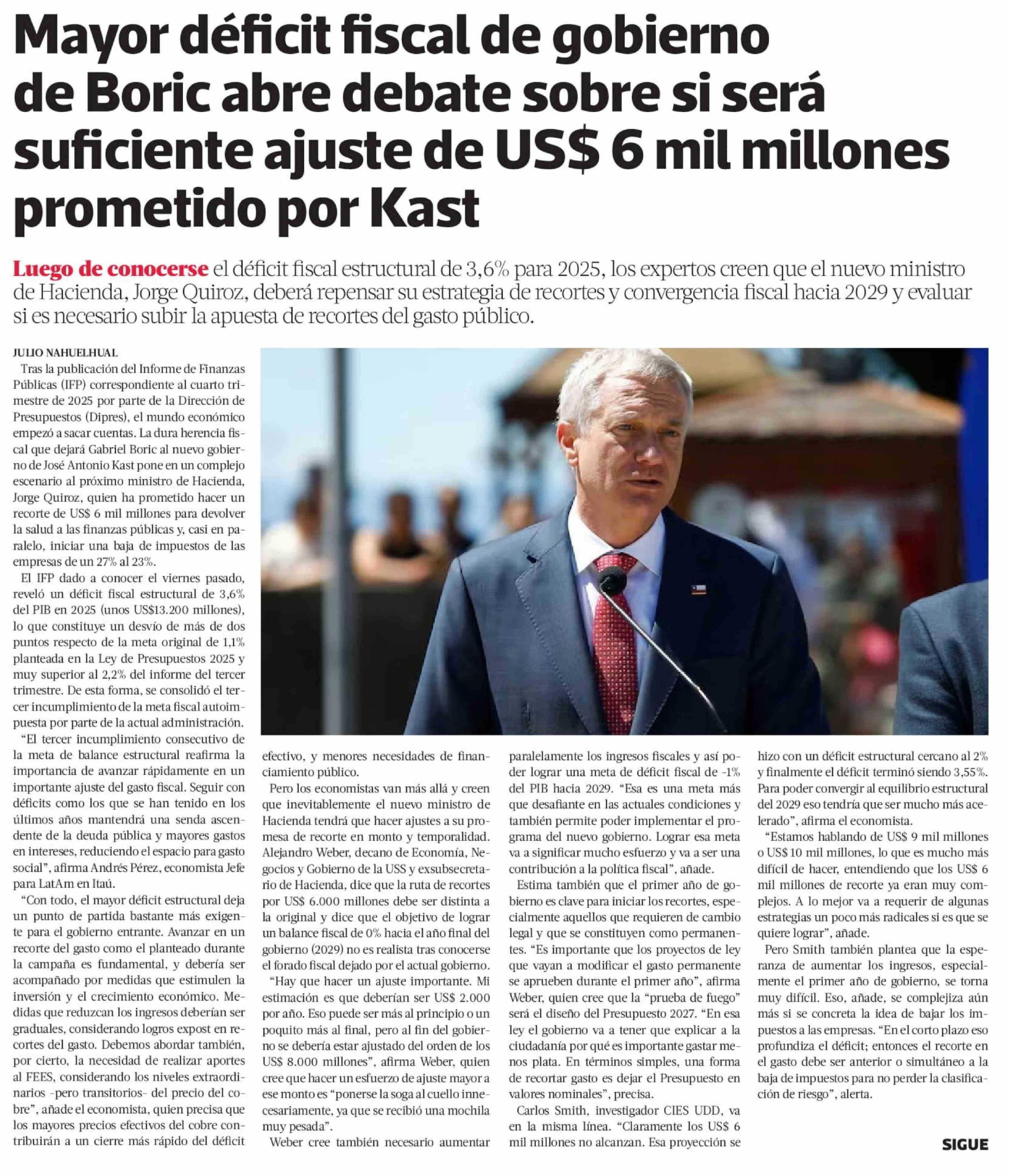Mayor déficit fiscal de gobierno de Boric abre debate sobre si será suficiente ajuste de US$ 6 mil millones prometido por Kast 17-02-2026 La Tercera |