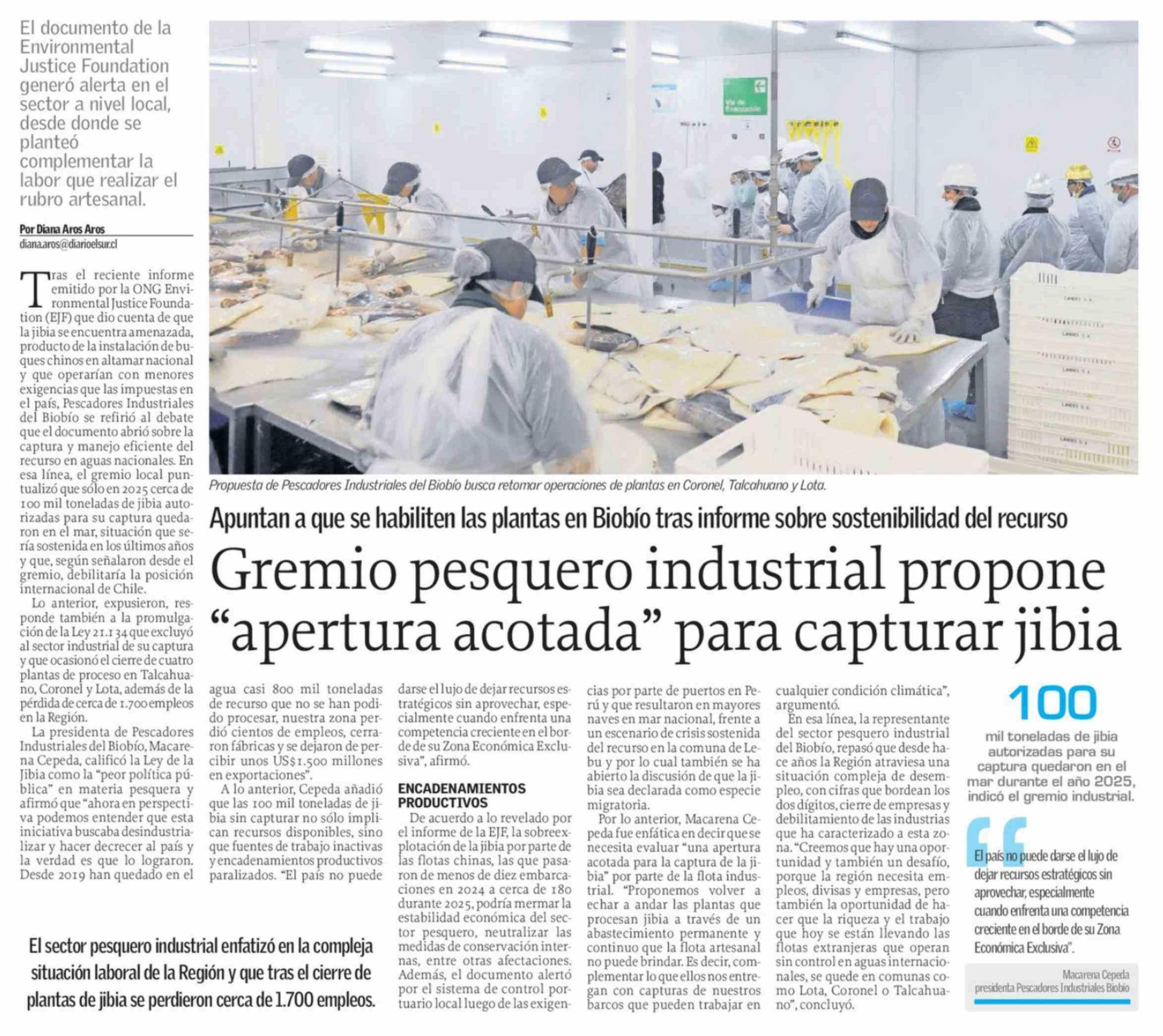 Gremio pesquero industrial propone "apertura acotada" para capturar jibia 26-02-2026 El Sur |