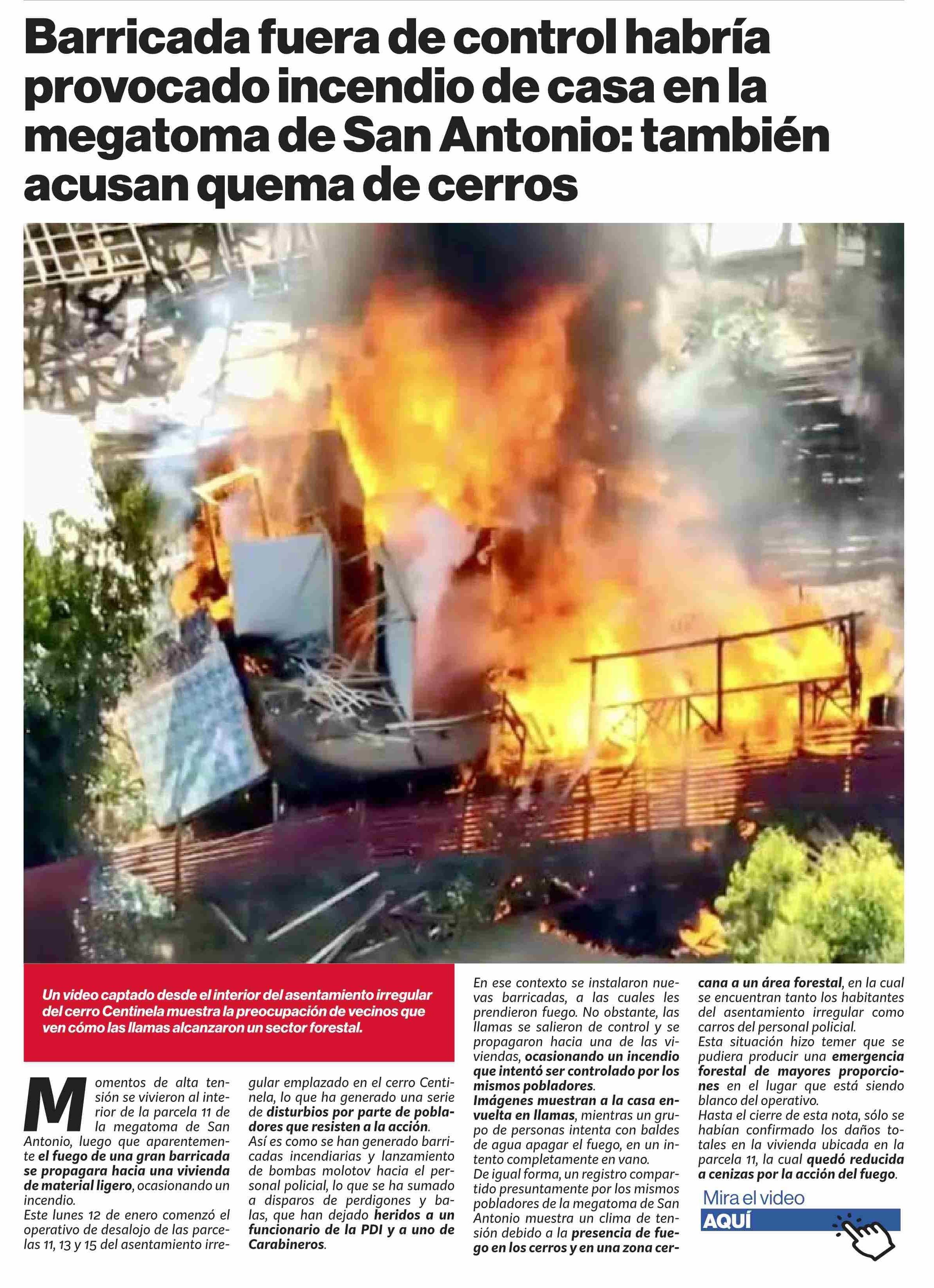 Título: Barricada fuera de control habría provocado incendio de casa en la megatoma de San Antonio: también acusan quema de cerros