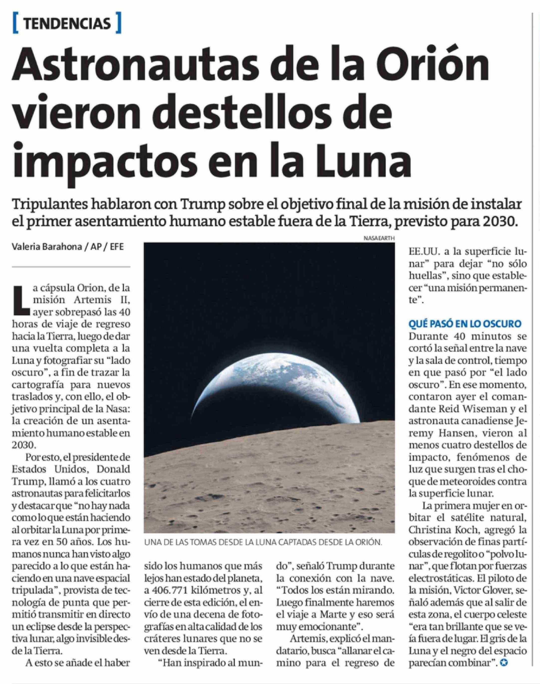 Título: Astronautas de la Orión vieron destellos de impactos en la Luna