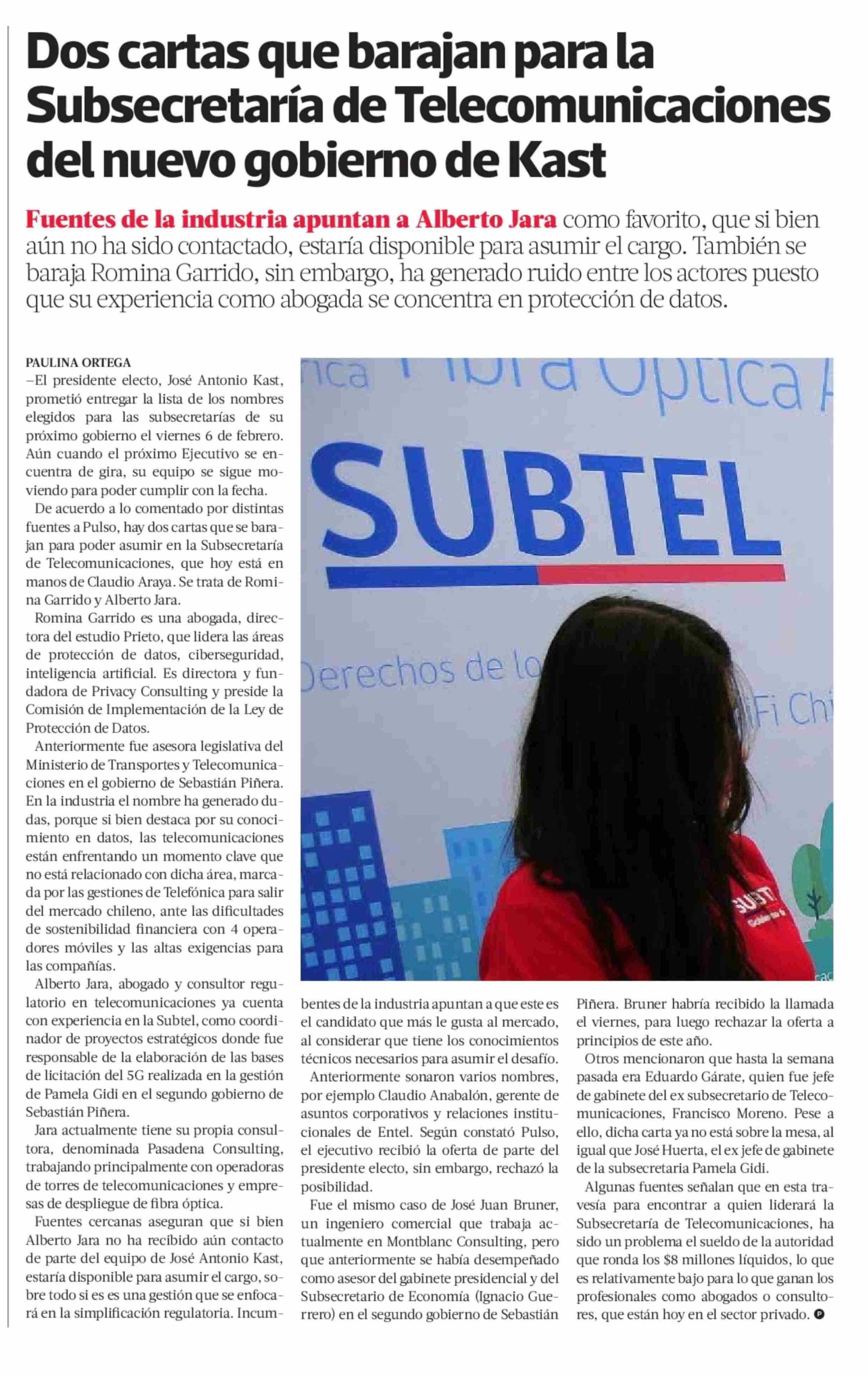Dos cartas que barajan para la Subsecretaría de Telecomunicaciones del nuevo gobierno de Kast 29-01-2026 La Tercera |
