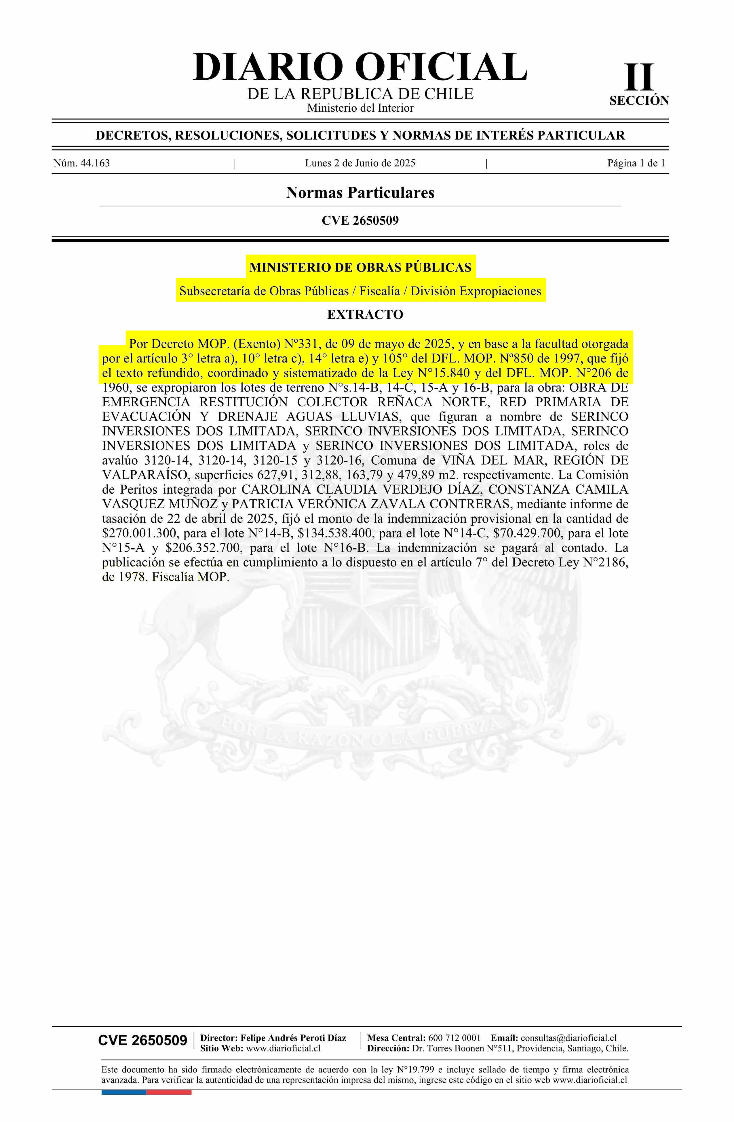 | Título: | Extracto de decreto exento número 331, de 2025.- Serinco Inversiones Dos Limitada |