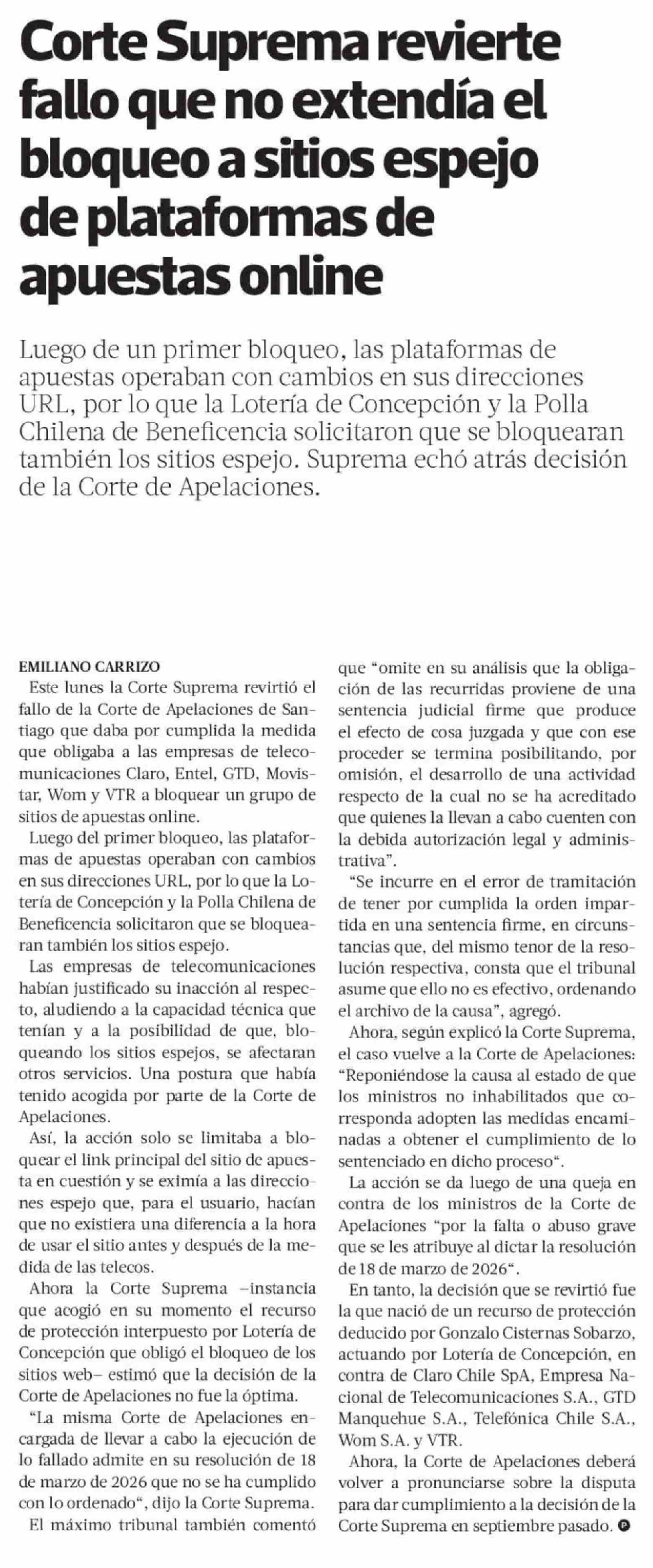 Título: Corte Suprema revierte fallo que no extendía el bloqueo a sitios espejo de plataformas de apuestas online
