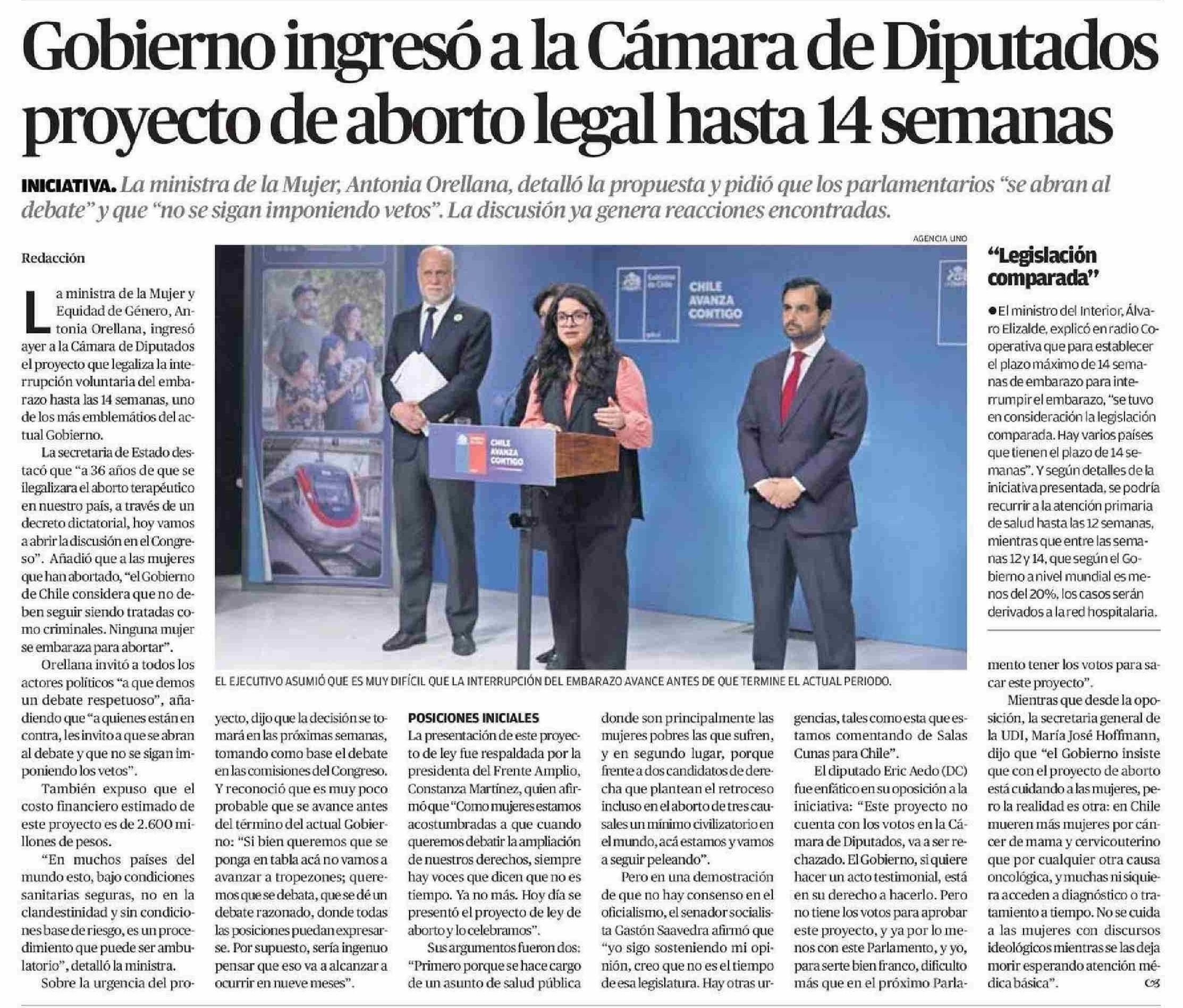 Gobierno ingresó a la Cámara de Diputados proyecto de aborto legal hasta 14 semanas 29-05-2025 El Mercurio de Calama |
