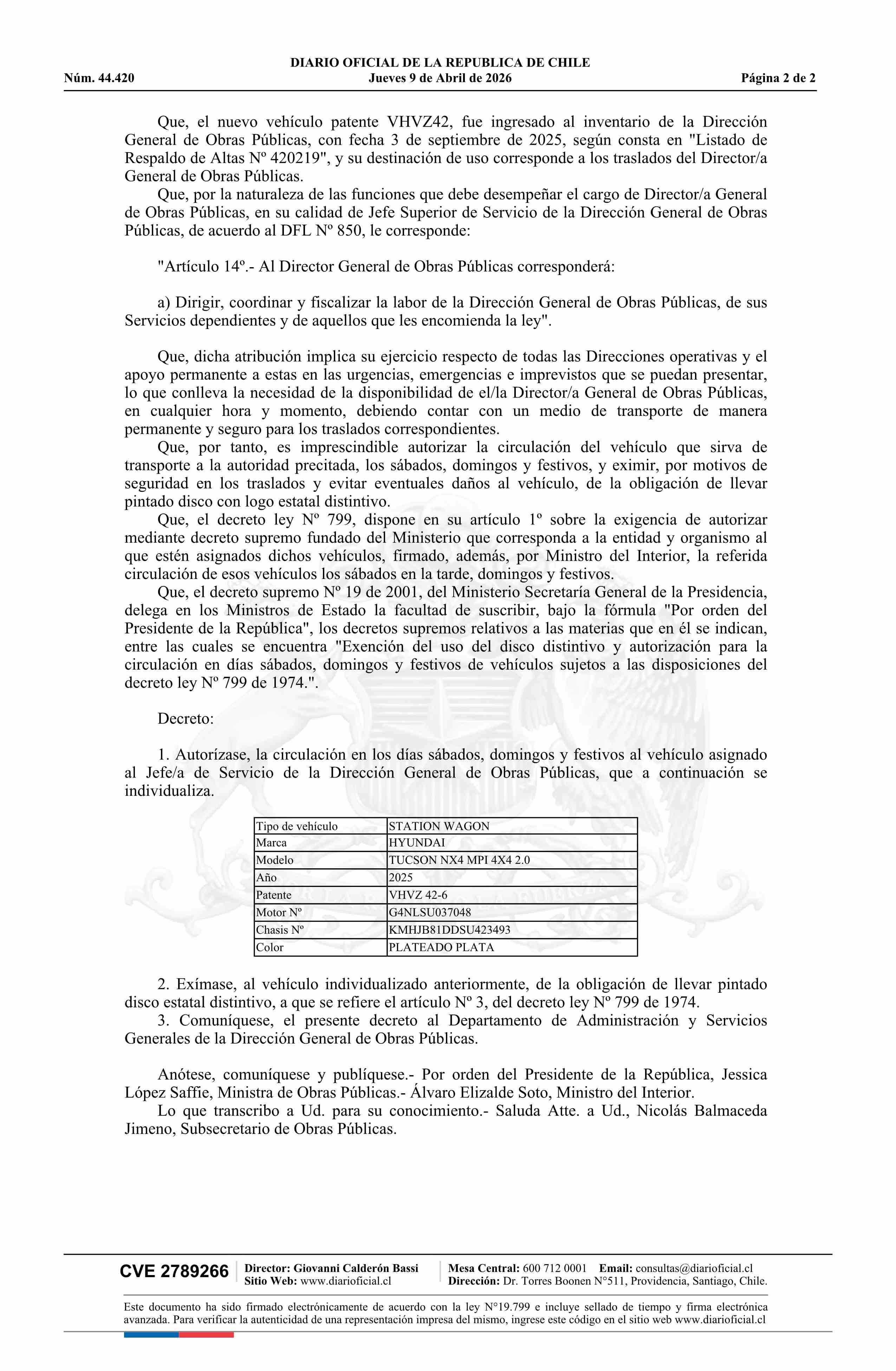 Título: Decreto exento número 30, de 2026.- Autoriza circulación de vehículo de la Dirección General de Obras Públicas que se indica, en días sábado, domingo y festivos, y lo excluye del uso de disco fiscal
