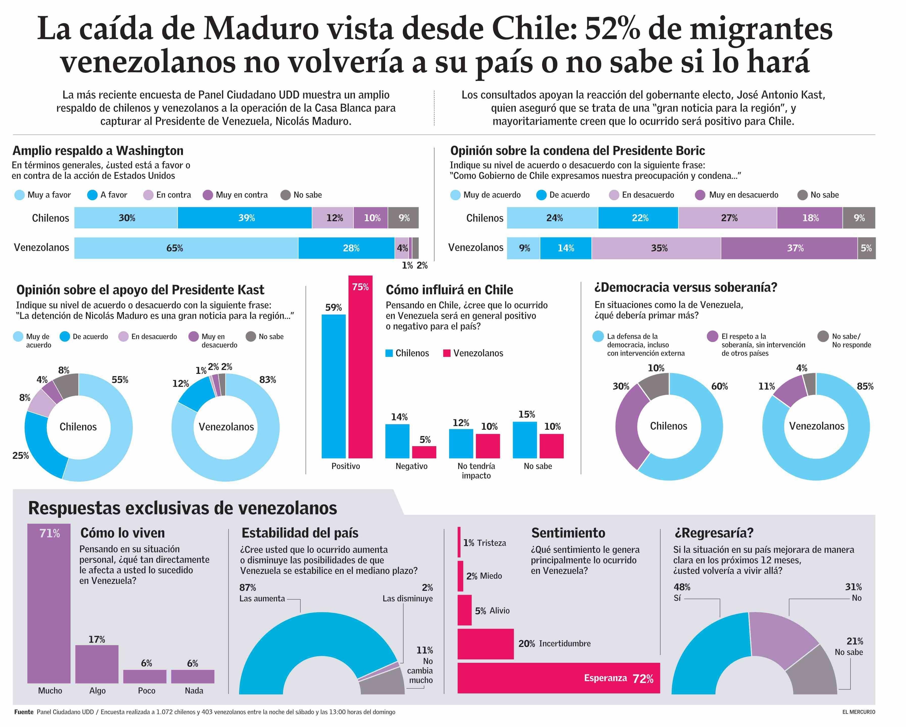 La caída de Maduro vista desde Chile: 52% de migrantes venezolanos no volvería a su país o no sabe si lo hará 06-01-2026 El Mercurio |