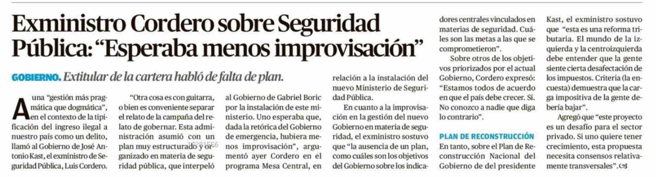 | Título: | Exministro Cordero sobre Seguridad Pública: "Esperaba menos improvisación" |