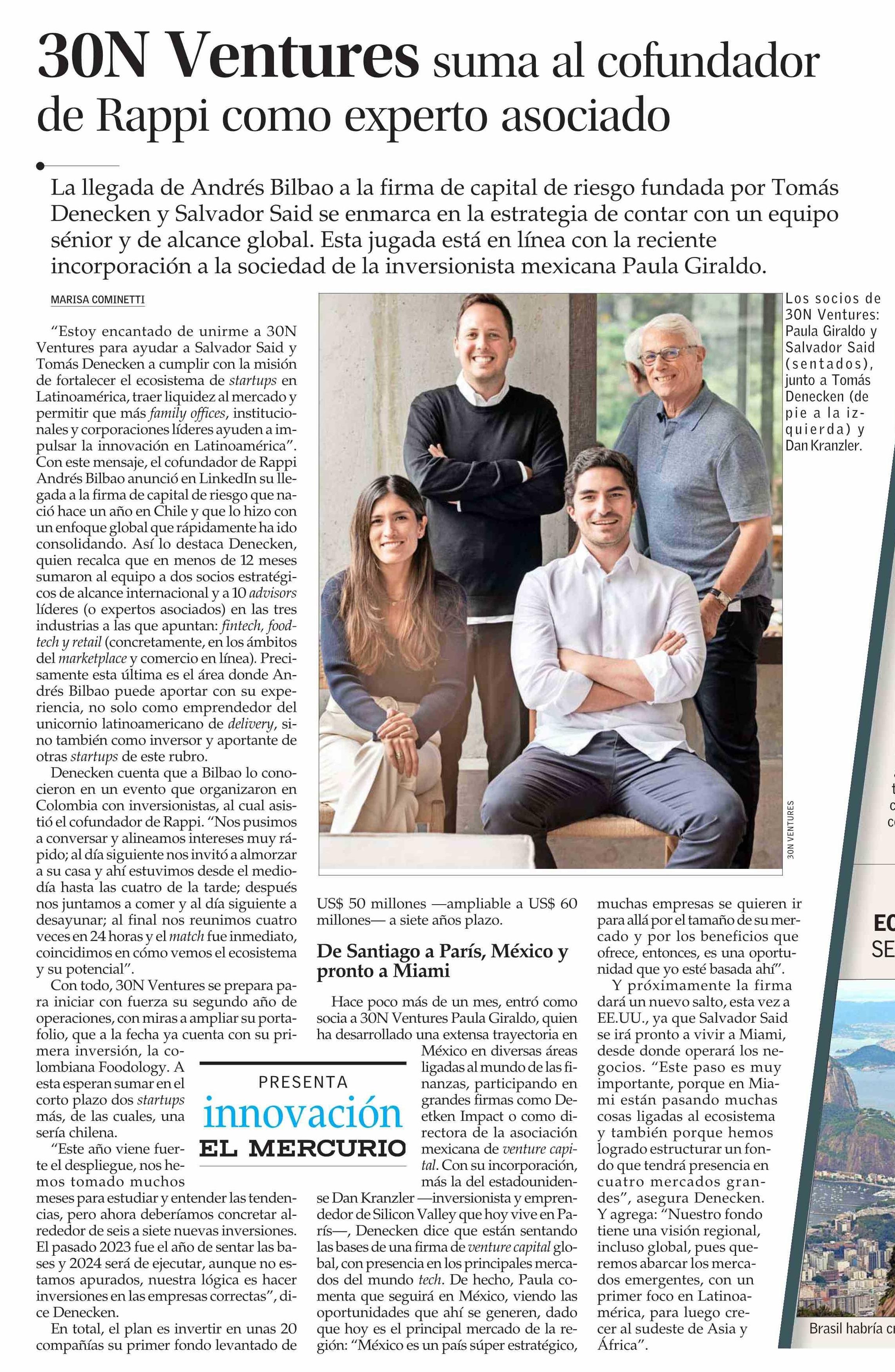 30N Ventures suma al cofundador de Rappi como experto asociado 03-01-2024 El Mercurio |