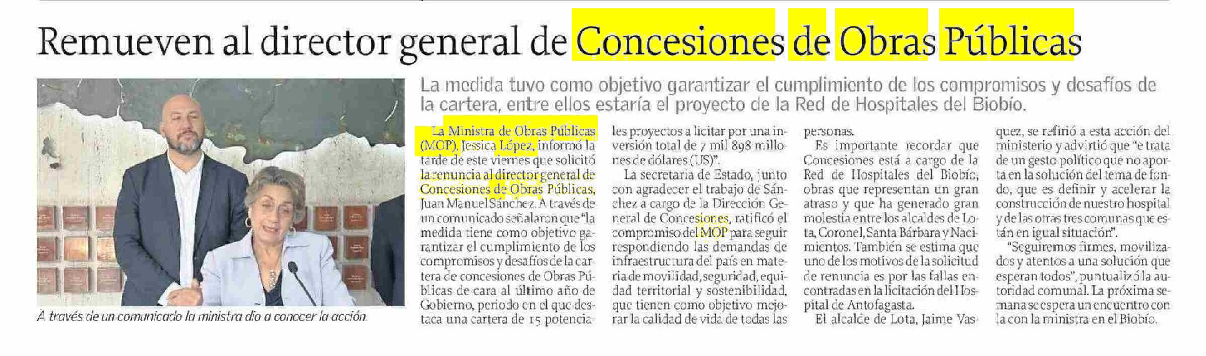 Remueven al director general de Concesiones de Obras Públicas 18-05-2025 El Sur |