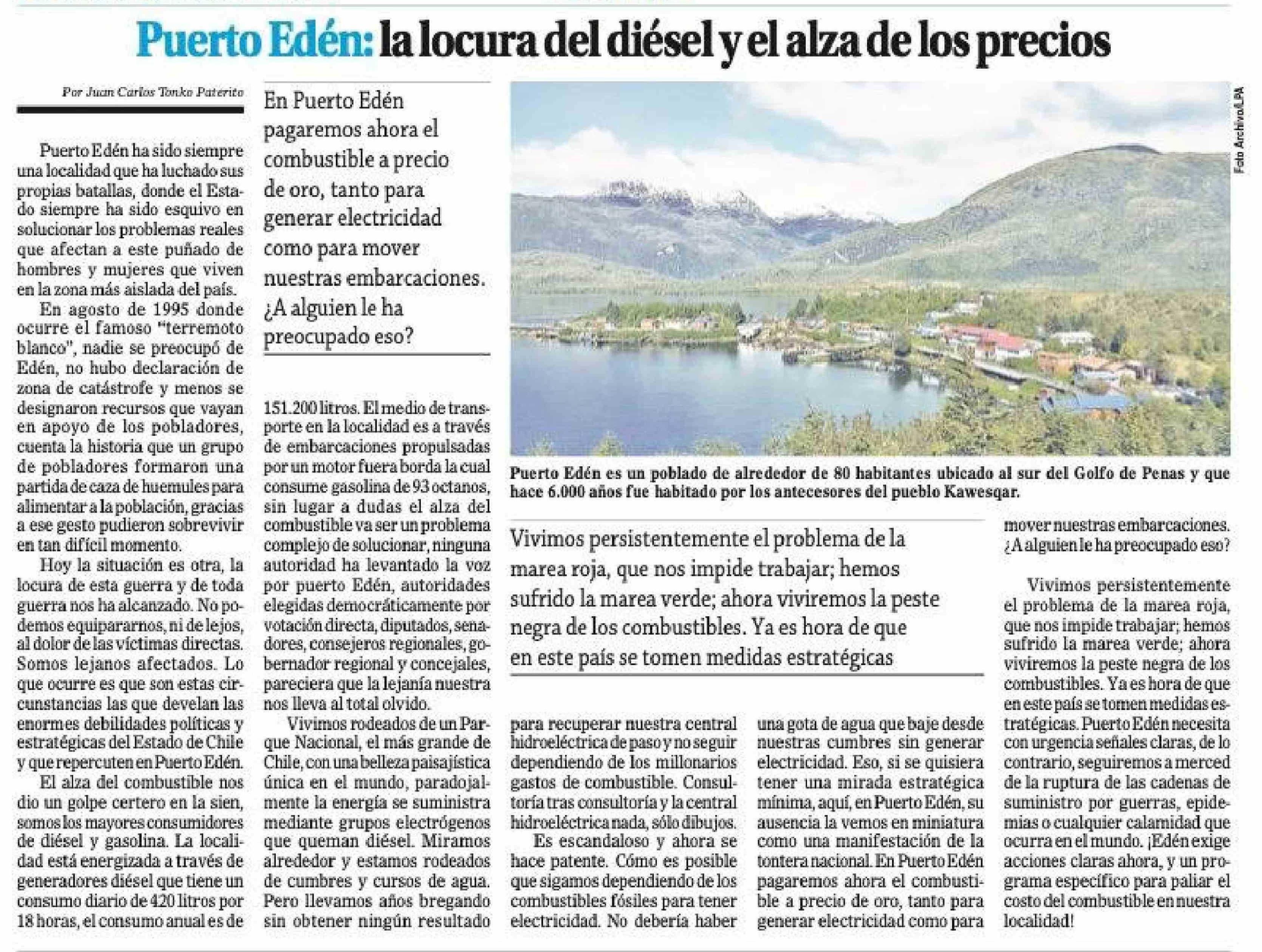 | Título: | Puerto Edén: la locura del diésel y el alza de los precios |