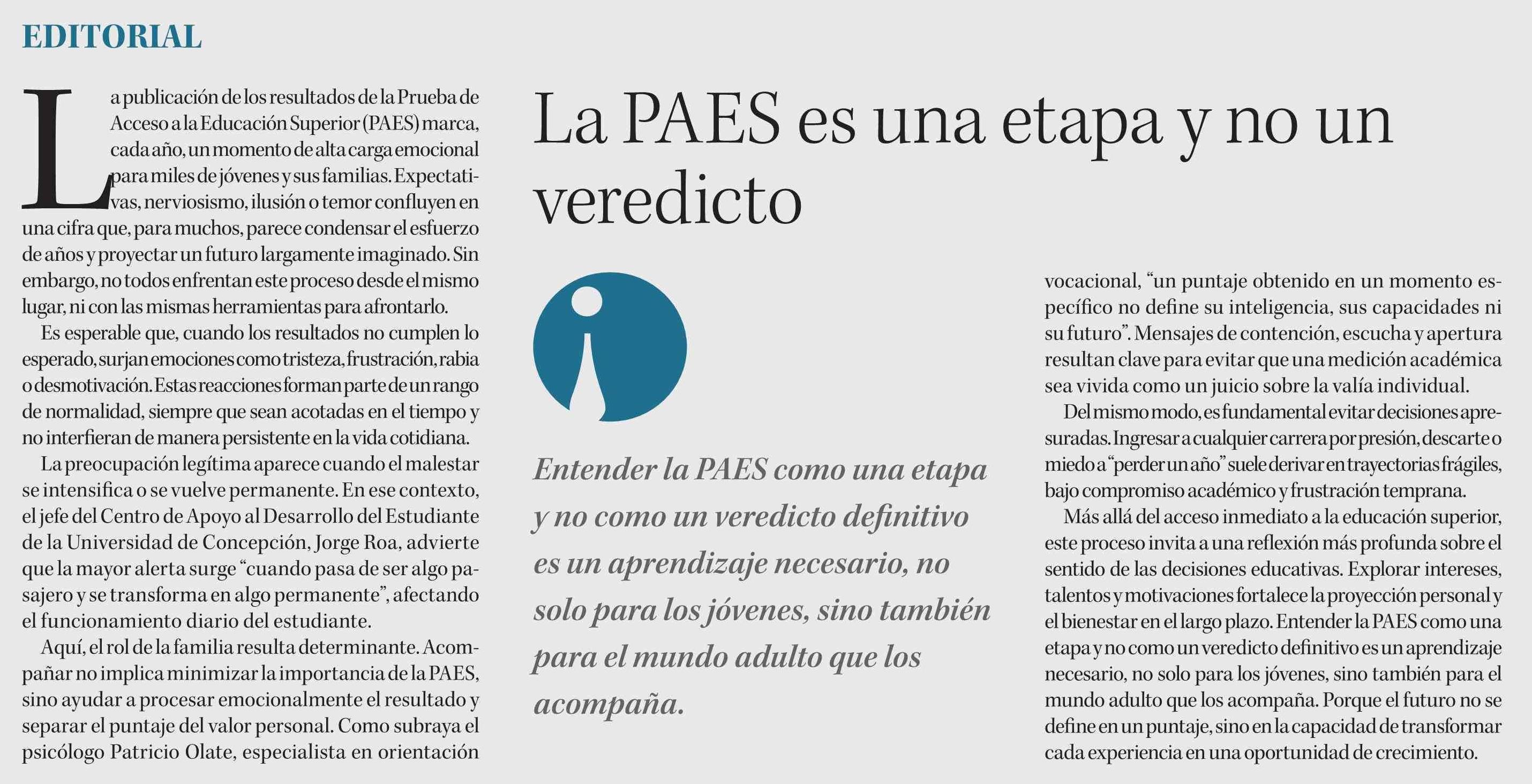 Editorial: La PAES es una etapa y no un veredicto 05-01-2026 Diario Concepción |